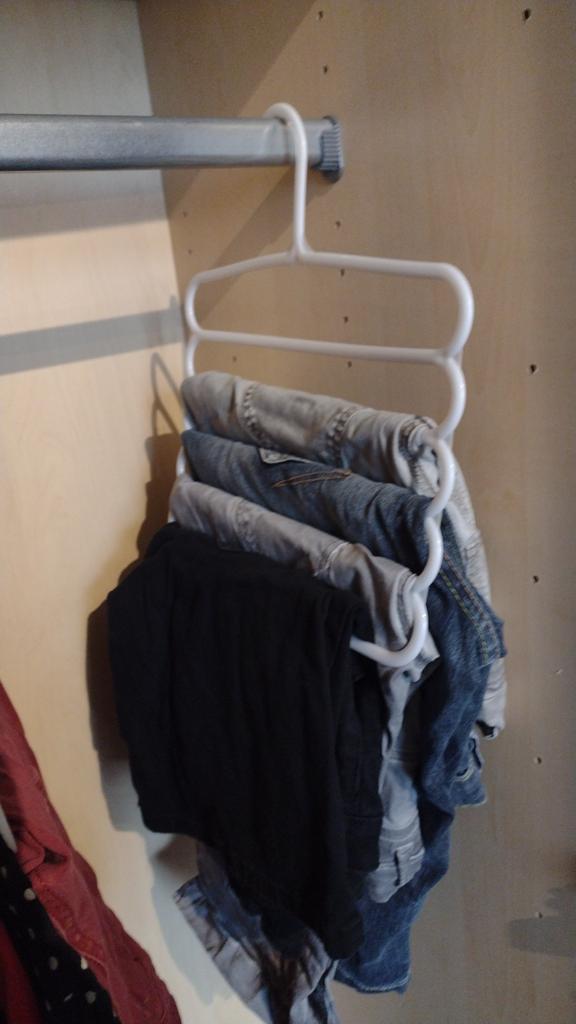 Menší než jsem myslela, ale kalhoty na to snad dám. jinak pevné 👍 to jsem chtěla (červené klasické ramínko pro porovnání)