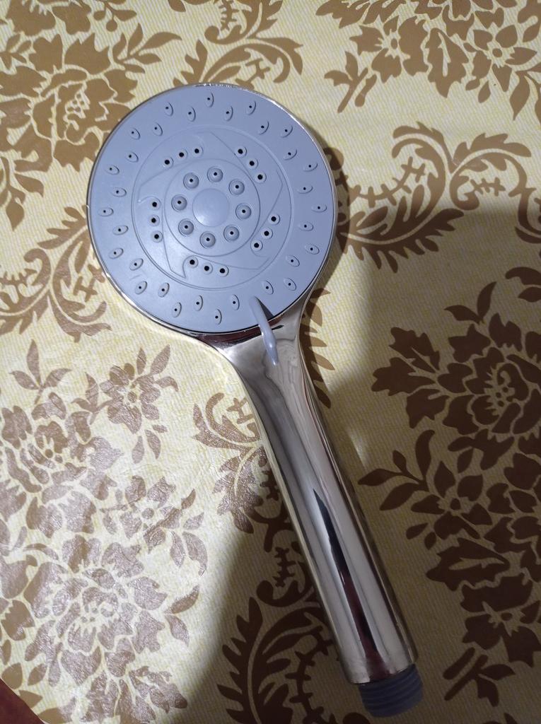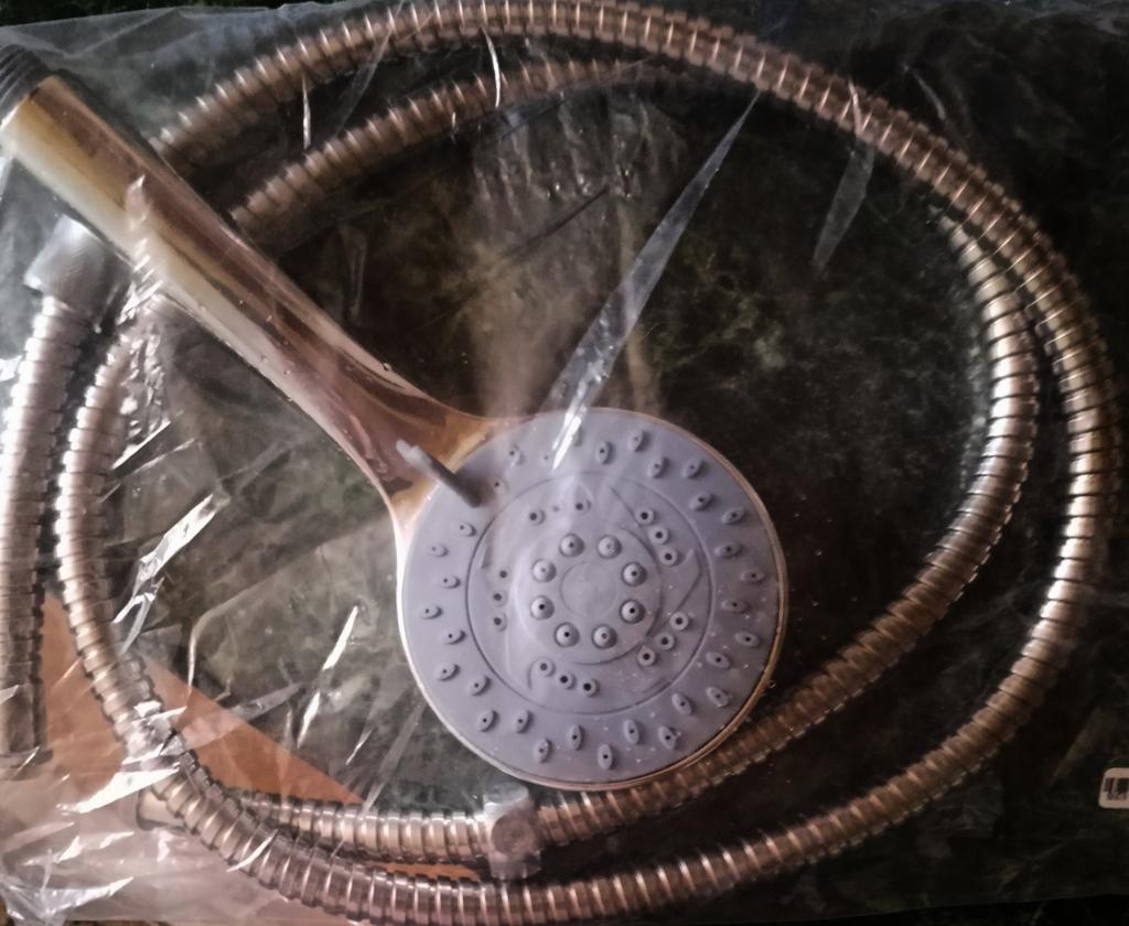 A very "noisy" shower head... In reality, it is quite miniature... In the photo: a shower head from Juma is on the left, a shower head on the right (standard size) is on the right.
