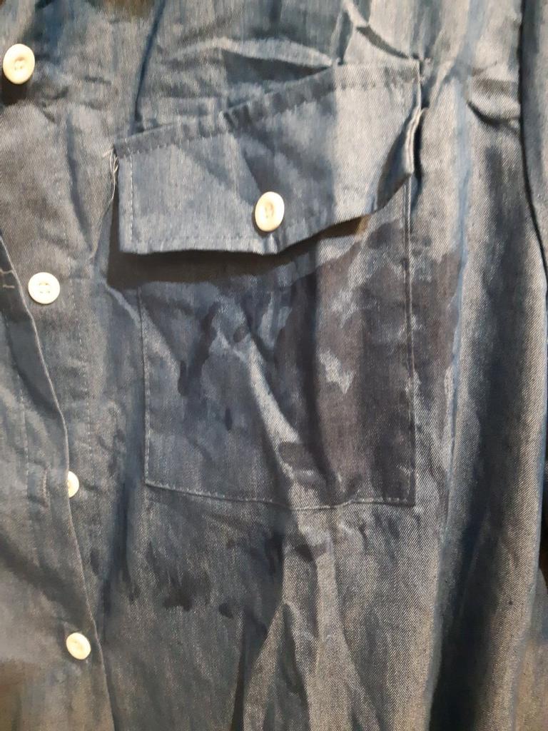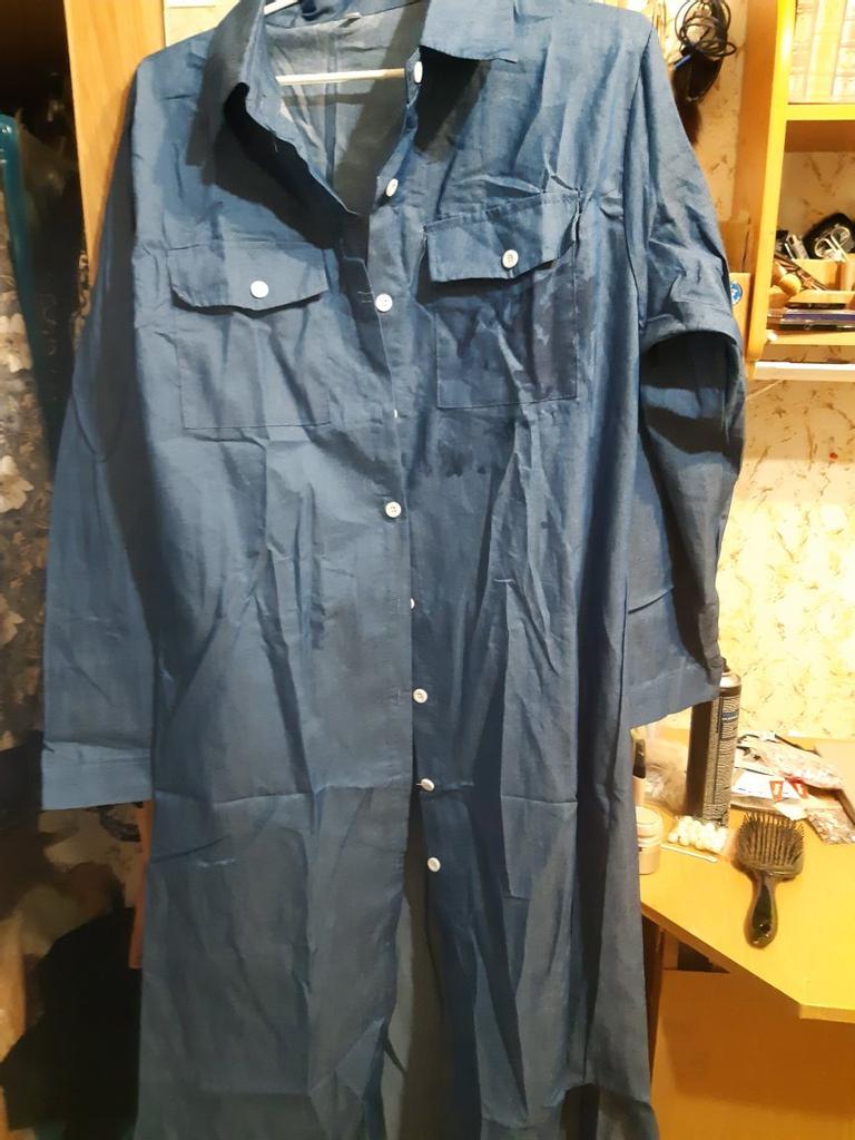 The dress looks like work clothes, in the photo it seemed like the material was denim.