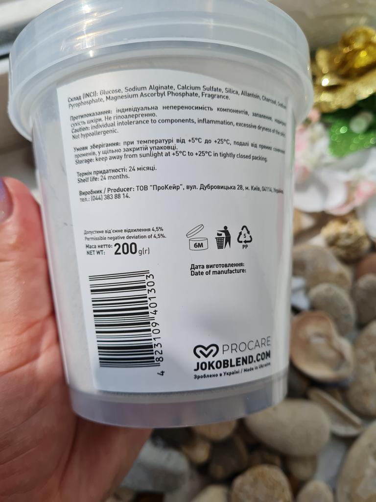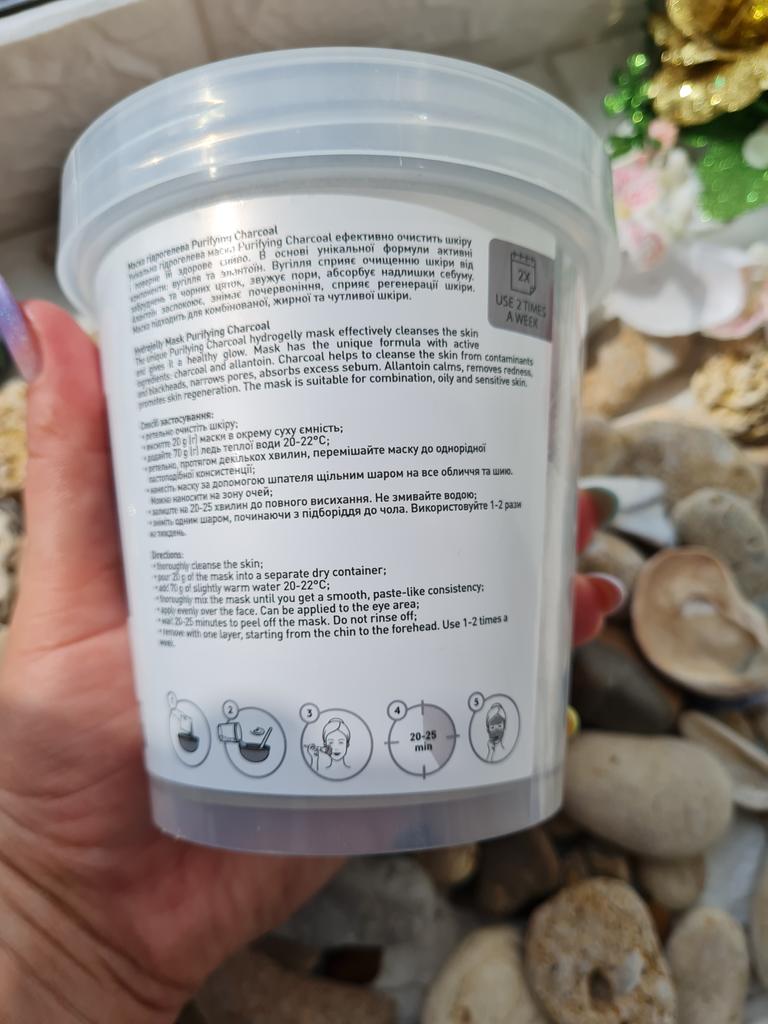 The unique Purifying Charcoal hydrogel mask will effectively cleanse the skin and restore a healthy glow. It has the form of a powder with an active ingredient - coal and upon contact with water it turns into a homogeneous thick hydrogel consistency. The mask hardens, and its components begin to work actively, penetrating into the deep layers of the epidermis. Features of the hydrogel mask Purifying Charcoal Joko Blend 200 g: sodium alginate in the mask strengthens collagen cells, tightens pores, normalizes the oiliness of the skin, restores water balance; charcoal helps to cleanse the skin of impurities and blackheads, narrows pores, absorbs excess sebum; allantoin soothes, relieves redness, promotes skin regeneration; it is recommended to use the mask 1-2 times a week for a course of up to 10 applications; suitable for beauticians, beauty salons and home use; for an enhanced effect, it is recommended to use serums from the Hyaluronic Acid Gel series or other gel serums before applying the mask; in the complex, the hydrogel mask gives the skin a matte healthy look. Suitable for combination, oily and sensitive skin. How to properly apply a hydrogel mask? Stir the mask thoroughly for a few minutes until a homogeneous pasty consistency. The mask promotes deep penetration of beneficial elements and moisturizes the skin. For a more effective effect, you can apply a serum or emulsion before applying the mask. With a spatula, apply the mask to the face, including the eyes and lips. Apply the mask in a thick layer, it should apply direct pressure to the skin. The mask hardens completely in a few minutes. The next stage is plasticization, the mask becomes rubber-like, seized and fixed. The mask is removed in one motion, from the chin to the forehead. Wash off the remnants of the mask with water. Important! The mask hardens in a few minutes, so mix and apply quickly.