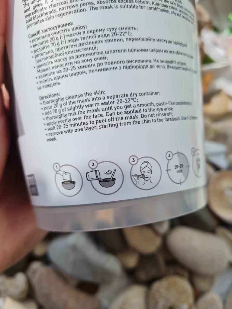 How to use: Thoroughly cleanse the skin. Pour 20 g (g) of the mask into a separate dry container. Add 70 g (g) warm water 20-22 ° C. Stir the mask thoroughly for several minutes until a homogeneous pasty consistency. Apply the mask with a spatula in a thick layer all over the face and neck. Can be applied to the eye area. Leave it on for 20-25 minutes until dry. Do not rinse with water. Peel off in one layer, starting from the chin to the forehead. Use 1-2 times a week.