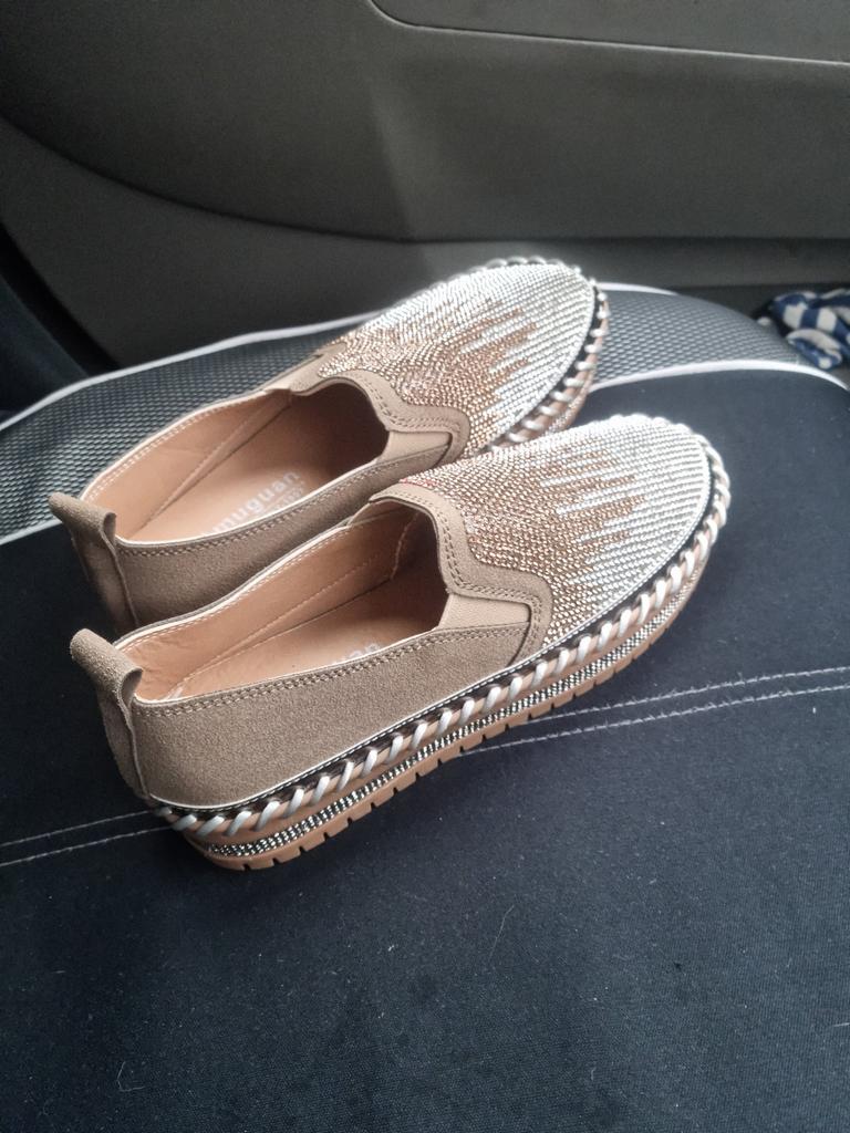 Beautiful and ultra comfortable shoe. Unfortunately, I still have to criticize that the size is one size smaller and unfortunately you can't follow the size chart, since size 36 should be 23cm. Unfortunately that's not true, so it's a bit too small. Next minus... One of the two shoes is sewn slightly crooked. You can see and feel that suffering.