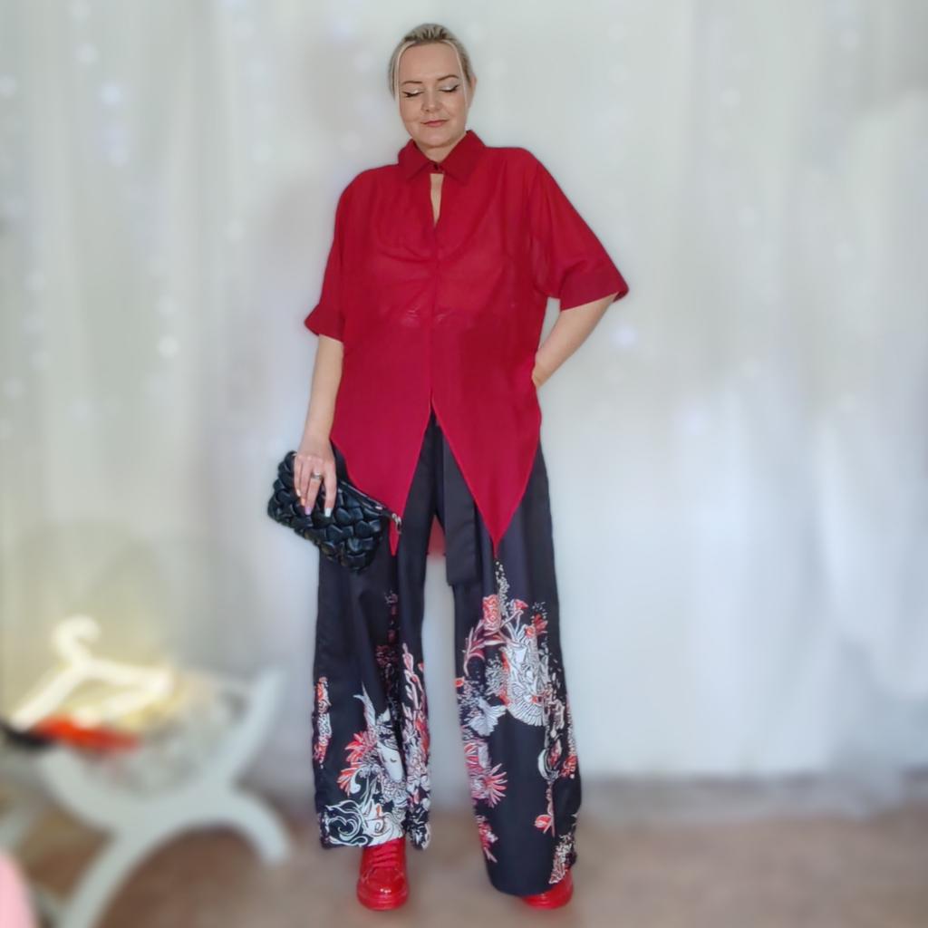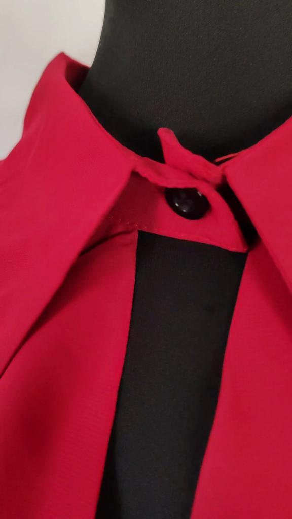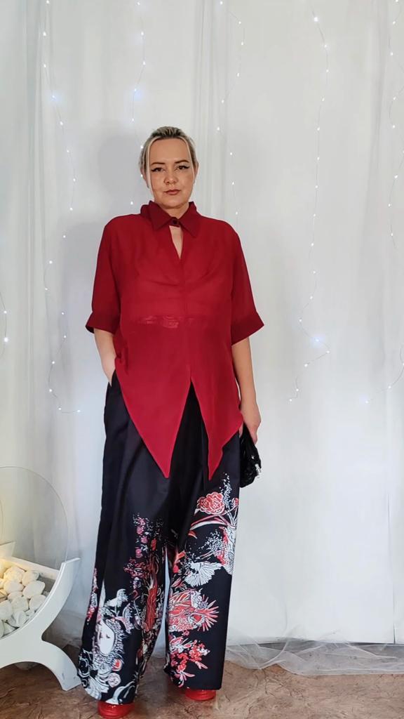 Chic Tunic in Silk Blend – Elegance and Versatility! ⭐⭐⭐⭐⭐ Material and Fit: I was enchanted by the lightness of this tunic. The mix of cotton, polyester, and a percentage of silk makes it incredibly soft, fluid, and comfortable against the skin. The fabric is semi-sheer (as seen in the photos), which adds a touch of refined sensuality without being excessive. I recommend wearing it over a basic tank top or a top for a layered look.. One Size: Being a one-size-fits-all, I was a little doubtful about the fit, but it turned out to be a pleasant surprise. The cut is loose and draped, which makes it perfect for different body types (it fits comfortably from an S to a generous L). As you can see from the photos, it looks good both left to hang loosely as a long tunic, and tied at the waist for a more playful effect and to define the silhouette.. Color and Design: The color is a beautiful deep and intense eggplant. The shirt collar and V-neck give it a very chic and sophisticated air. It's a super versatile piece: perfect to pair with a pair of light jeans and ballet flats for an elegant daytime look, or with black trousers and heels for a special evening.. Conclusions: Excellent value for money for a garment that includes a precious component like silk. It arrived well-packaged and on time. An purchase I absolutely recommend to those looking for a unique, comfortable, and elegant garment.💖💖💖