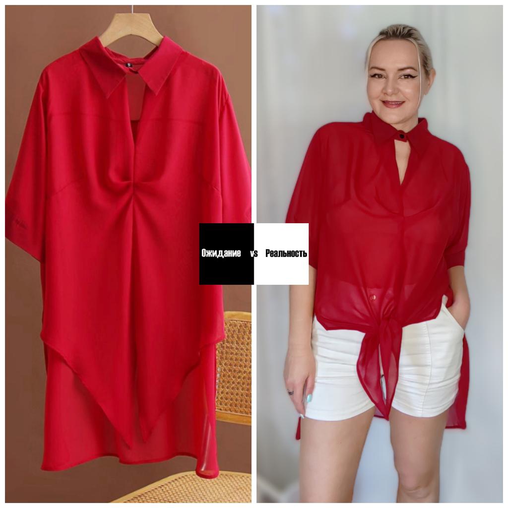 Great stylish blouse. Hides fullness. The threads stick out a little, it is ironed well, does not wrinkle. Size matches. My size is 52-54