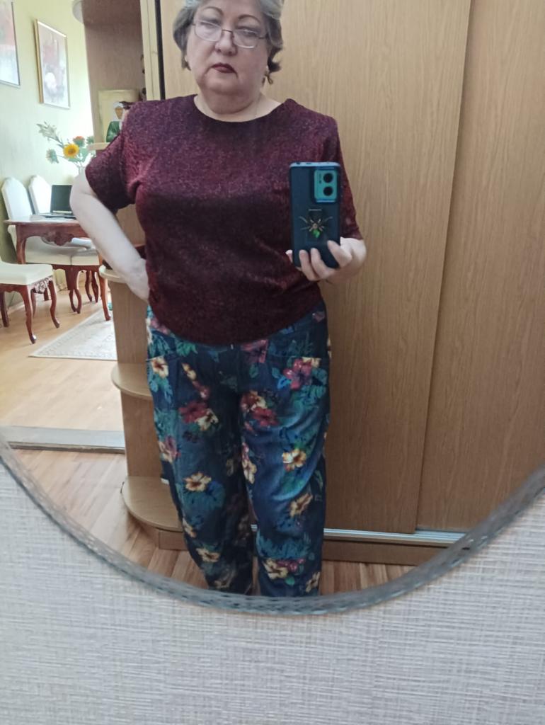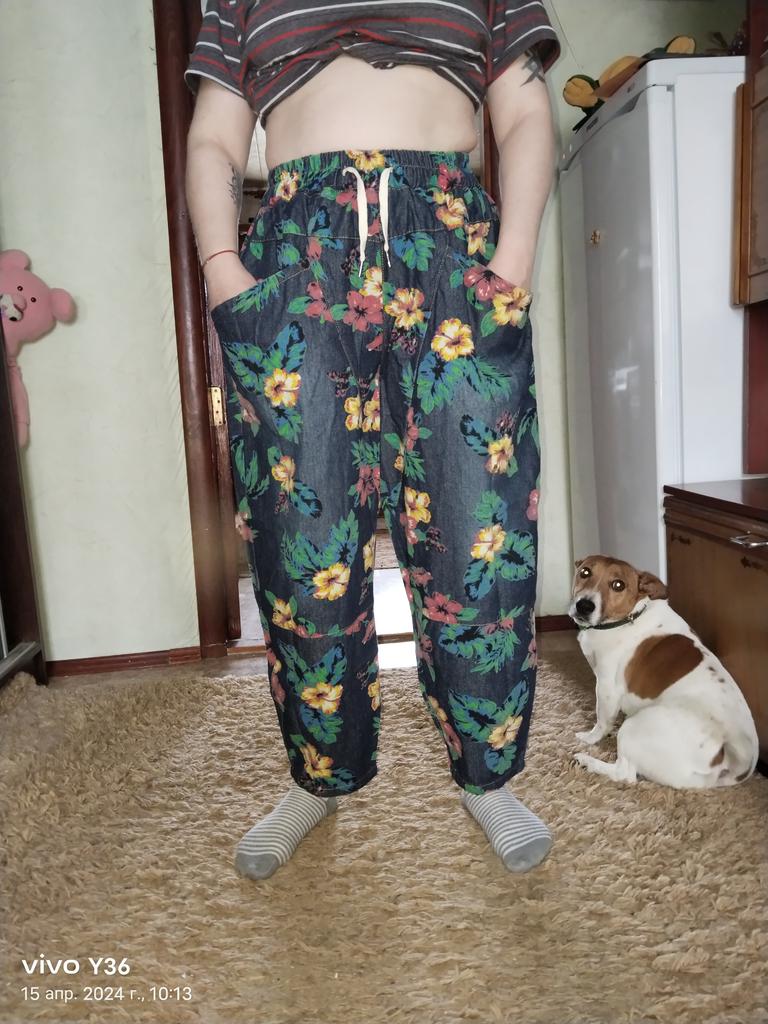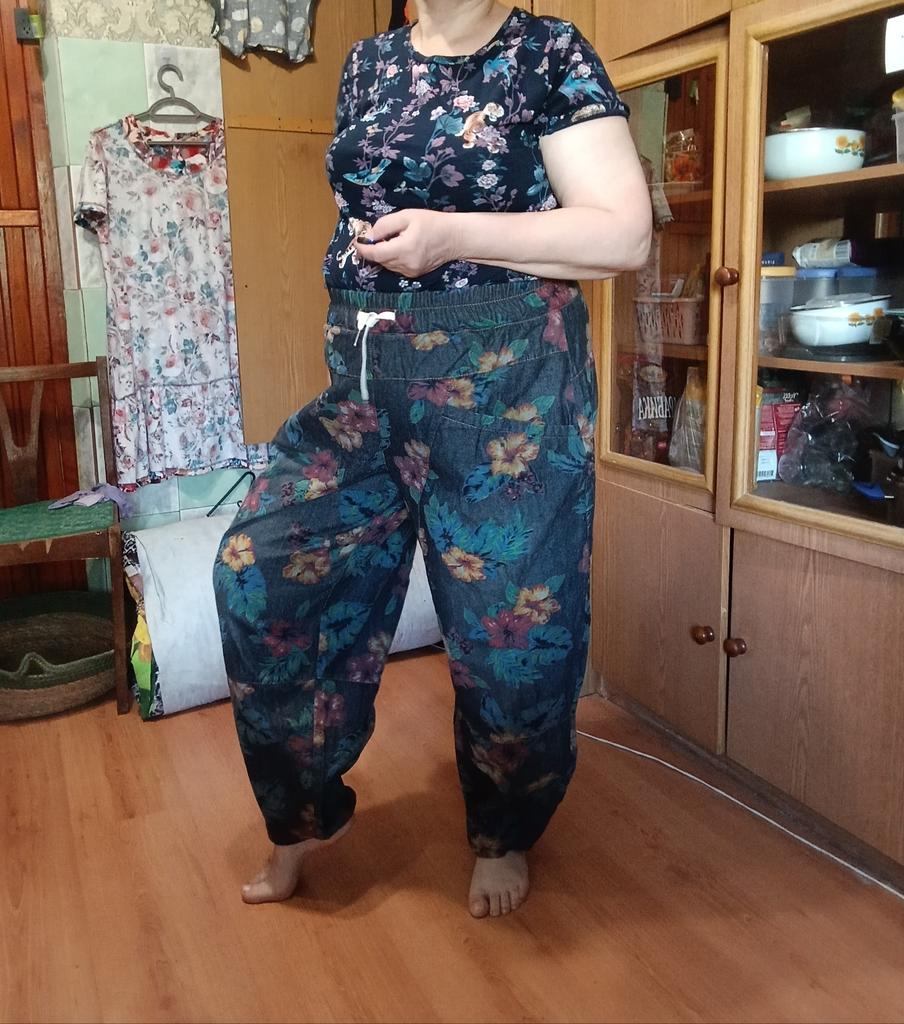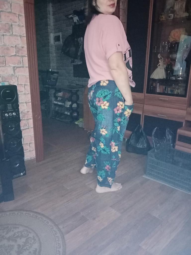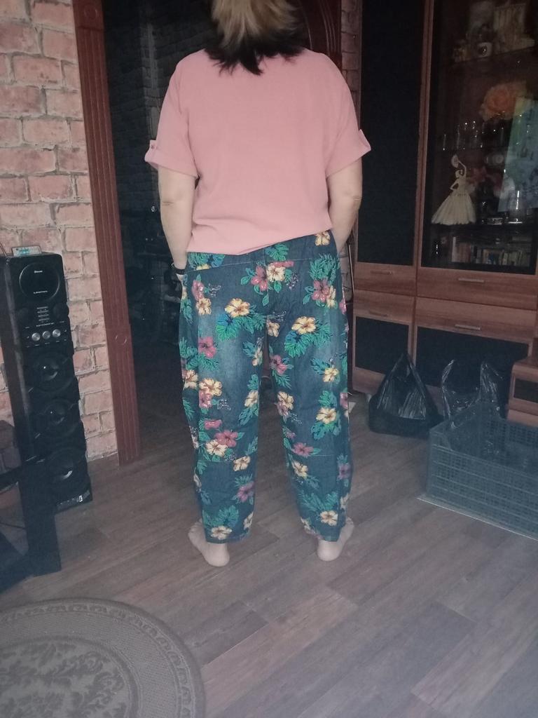Well, so much has already been written about the pants 😊 Cool. Unusual. Comfortable. My parameters: waist 86-88 cm. Hips 111-112 cm. I took XL so as not to stretch the waist. It would be possible to easily do L and even M. But then the elastic at the waist would quickly fray since it is not designed to fit 112 cm into it over and over again. Because of their cut, the jeans do not look big. Something like that. I wear it with pleasure.