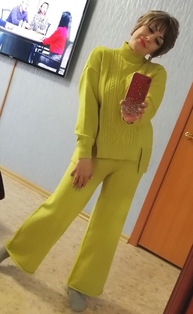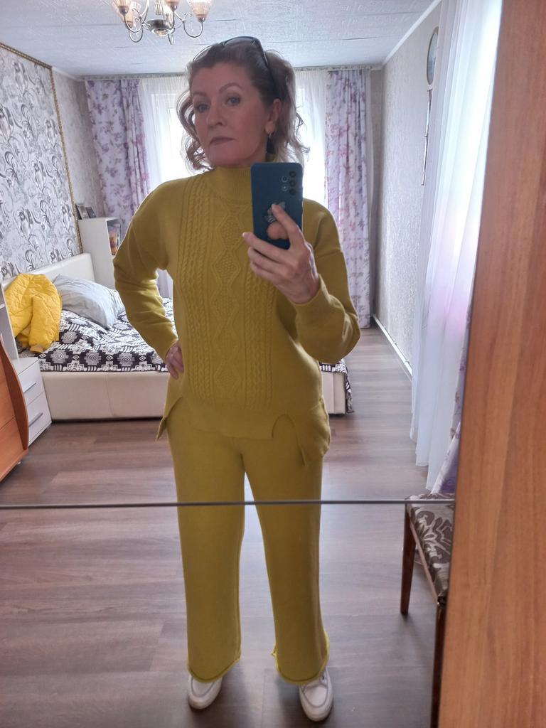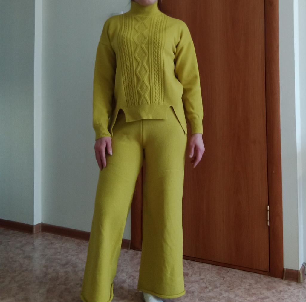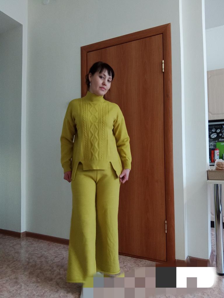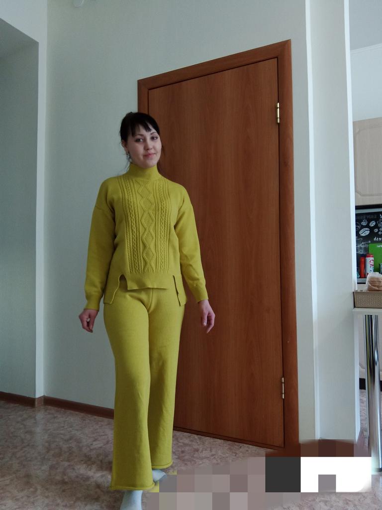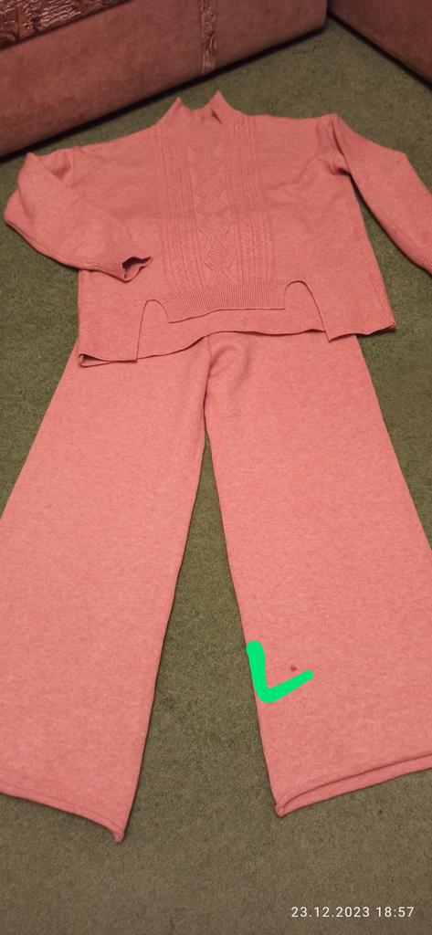 Knitted suit, dusty rose, I liked the color and quality and the suit itself. The knitwear is soft, warm, of medium density, does not wobble, stretches well. One minus - there are no tags or labels about the size or composition of the fabric. The full length of the sleeves and for a height of 162 cm, the length of the pants is full. My measurements: Height 98 cm From 82 cm About 108 cm. I recommend.