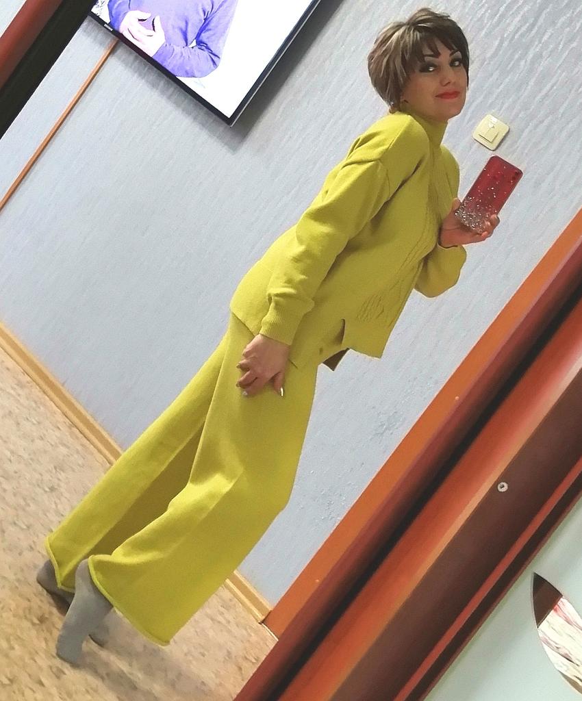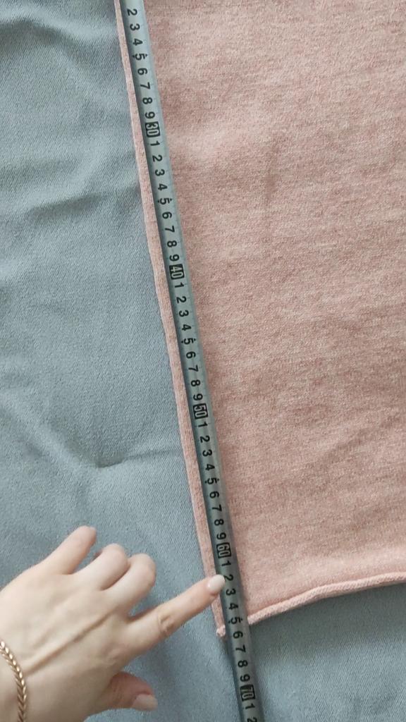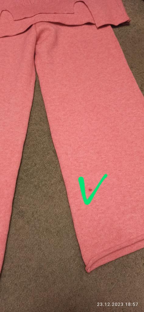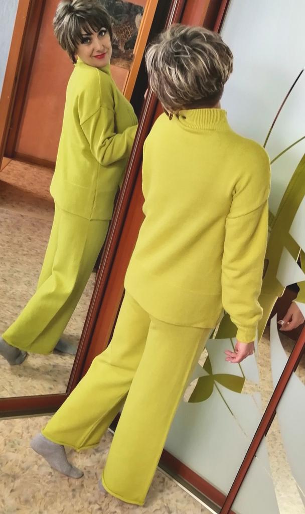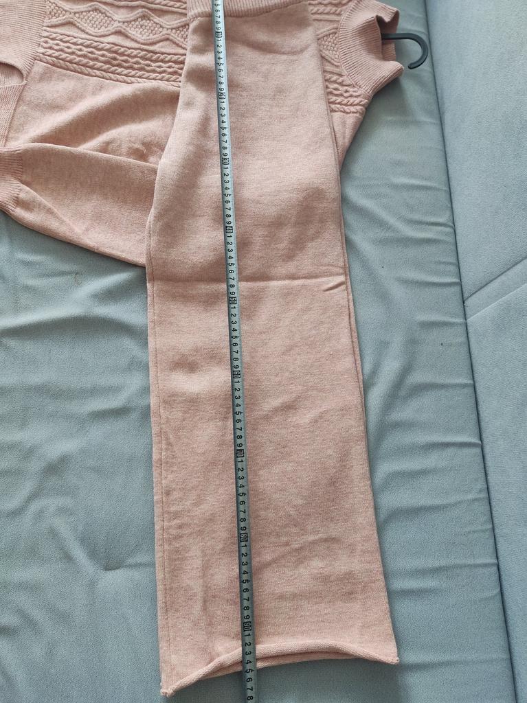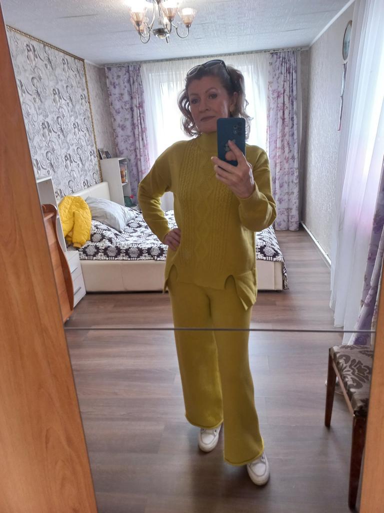 Knitted suit, dusty rose, I liked the color and quality and the suit itself. The knitwear is soft, warm, of medium density, does not wobble, stretches well. One minus - there are no tags or labels about the size or composition of the fabric. The full length of the sleeves and for a height of 162 cm, the length of the pants is full. My measurements: Height 98 cm From 82 cm About 108 cm. I recommend.