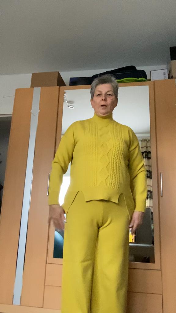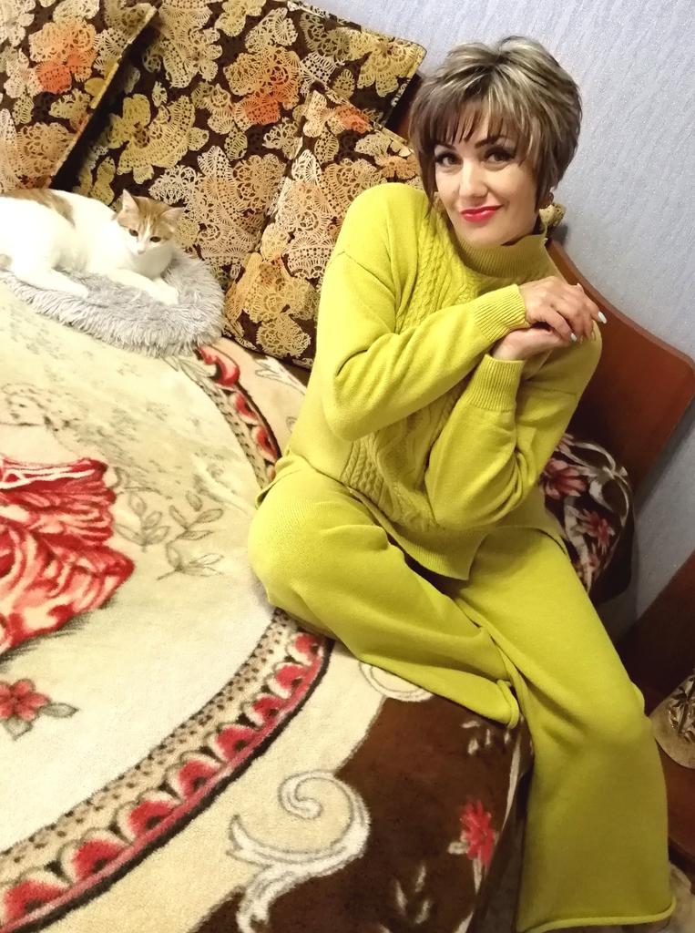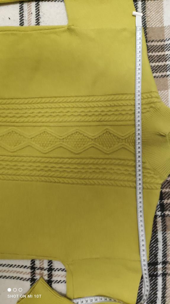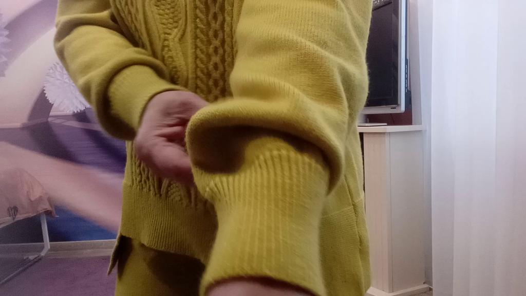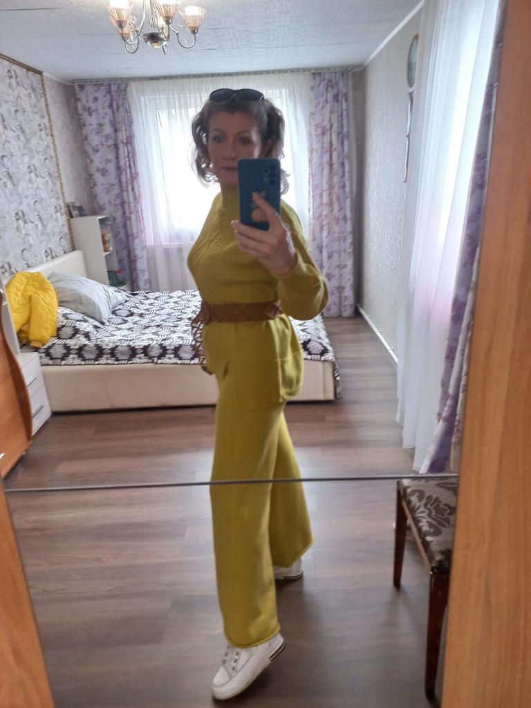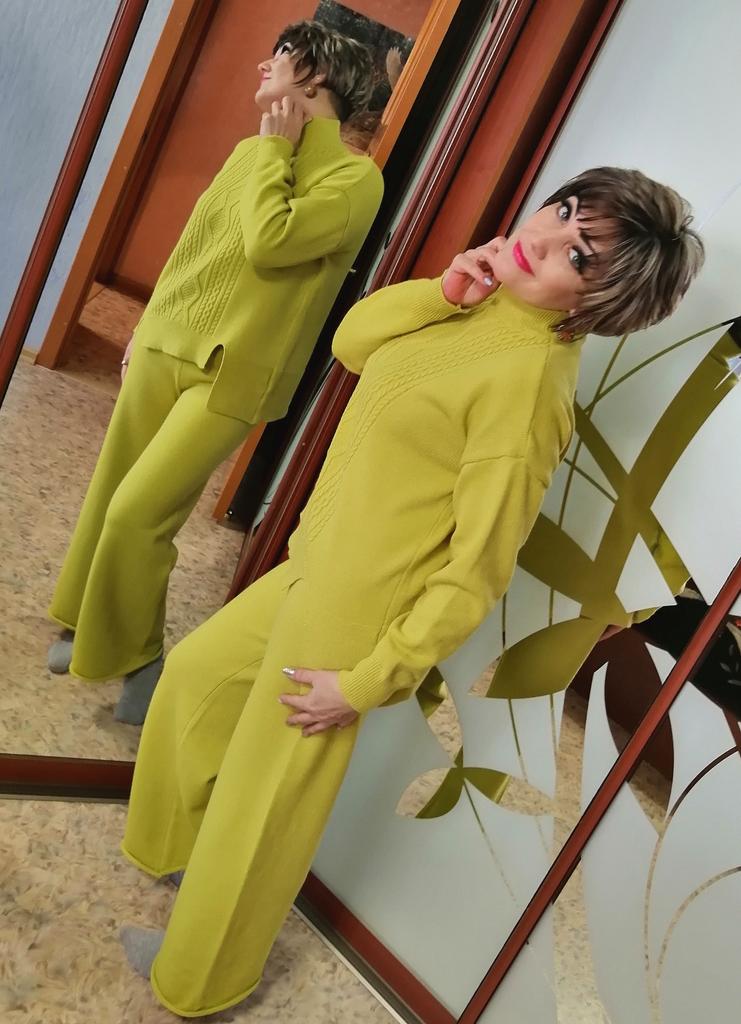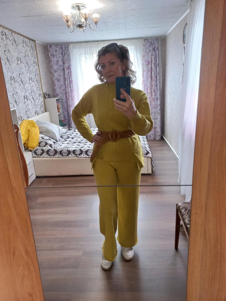 Knitted suit, dusty rose, I liked the color and quality and the suit itself. The knitwear is soft, warm, of medium density, does not wobble, stretches well. One minus - there are no tags or labels about the size or composition of the fabric. The full length of the sleeves and for a height of 162 cm, the length of the pants is full. My measurements: Height 98 cm From 82 cm About 108 cm. I recommend.