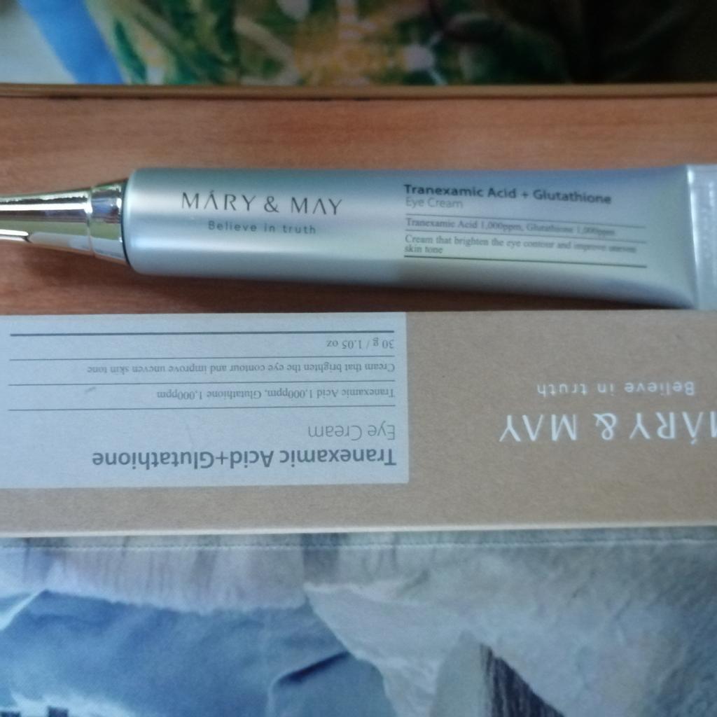 Mary&May Tranexamic Acid + Glutathione Eye cream, 1,000ppm tranexamic acid, 1,000ppm Glutathione for intensive care for dark circles in the eye contour.