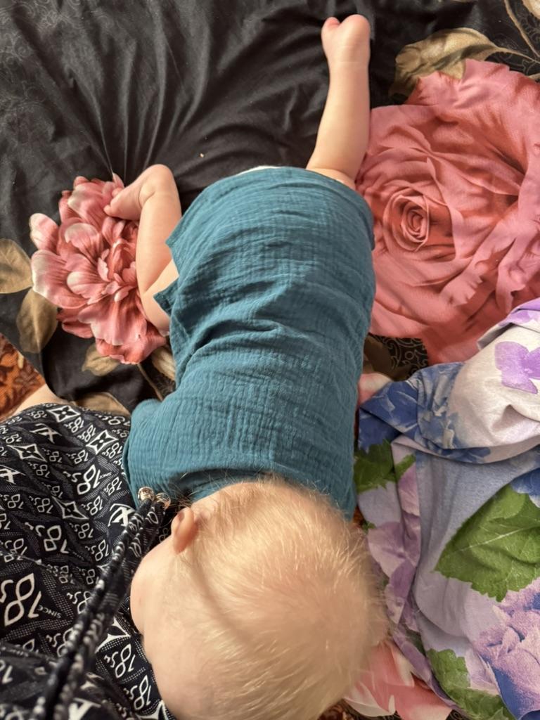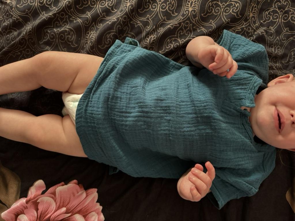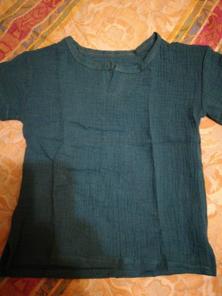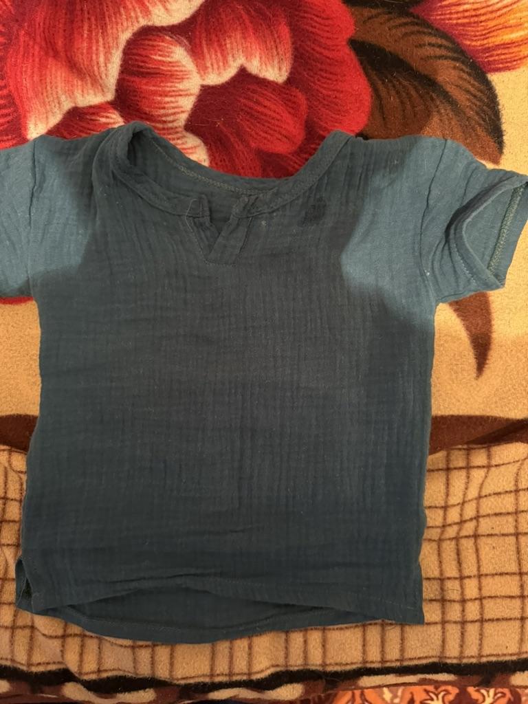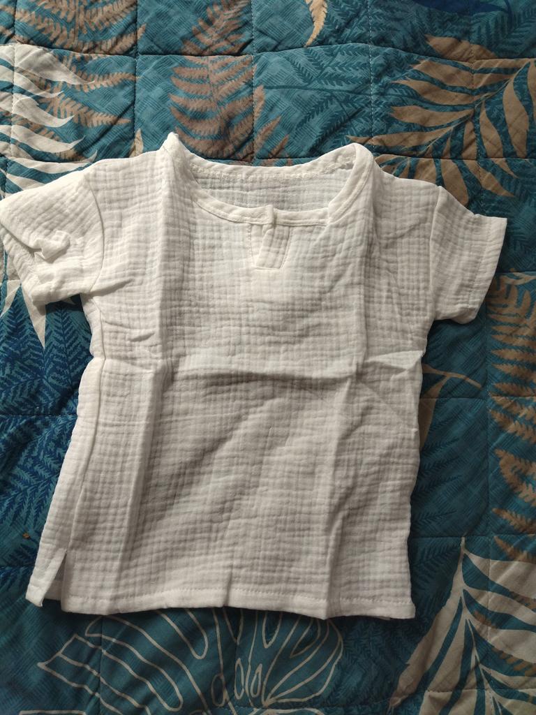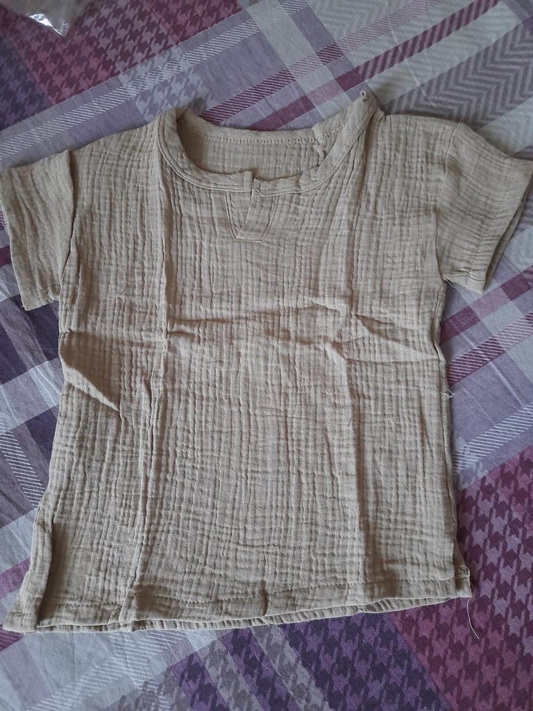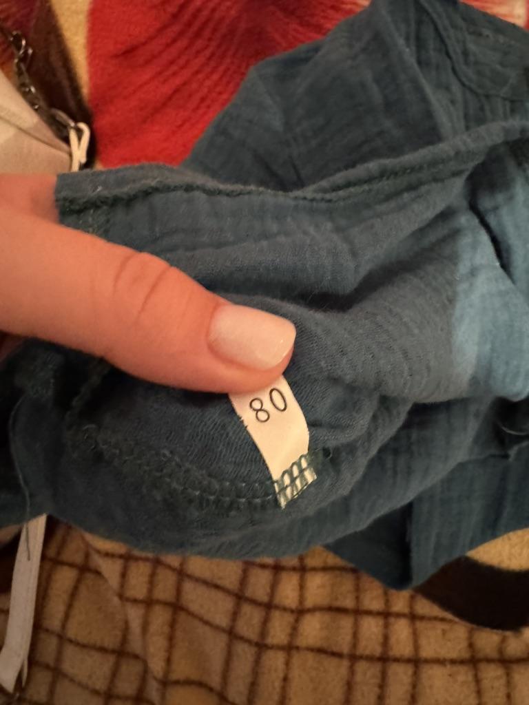 Very nice muslin T-shirt. There are no labels of any size or manufacturer on the product. And so all is well. We wear 90, so itโs a little big. Thank you. I recommend to buy