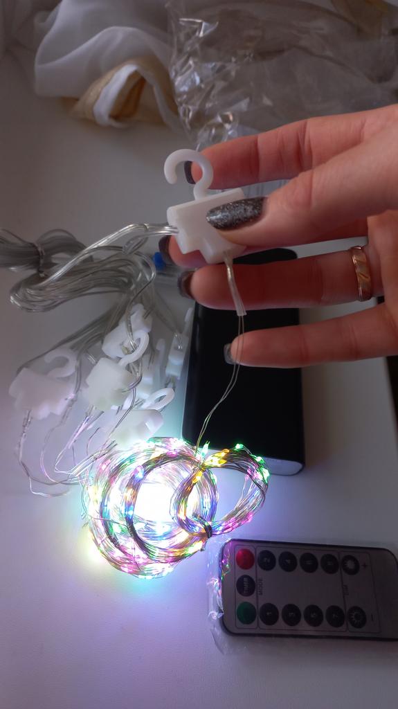 Cool garland, several modes of operation, the remote control already comes with a battery, this is a big plus. There are hooks. Definitely worth the money