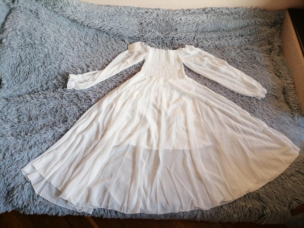 Spring Autumn Women Elegant Holiday Dresses Puff Sleeve Slash Neck Off Shoulder Smocked White Chiffon Dresses