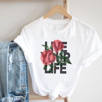 (Asian Size)Tee Top Fashion Flower Letter Summer Trend 90s T Shirt Clothing Casual Short Sleeve Women Print Lady Female Graphic T-shirt