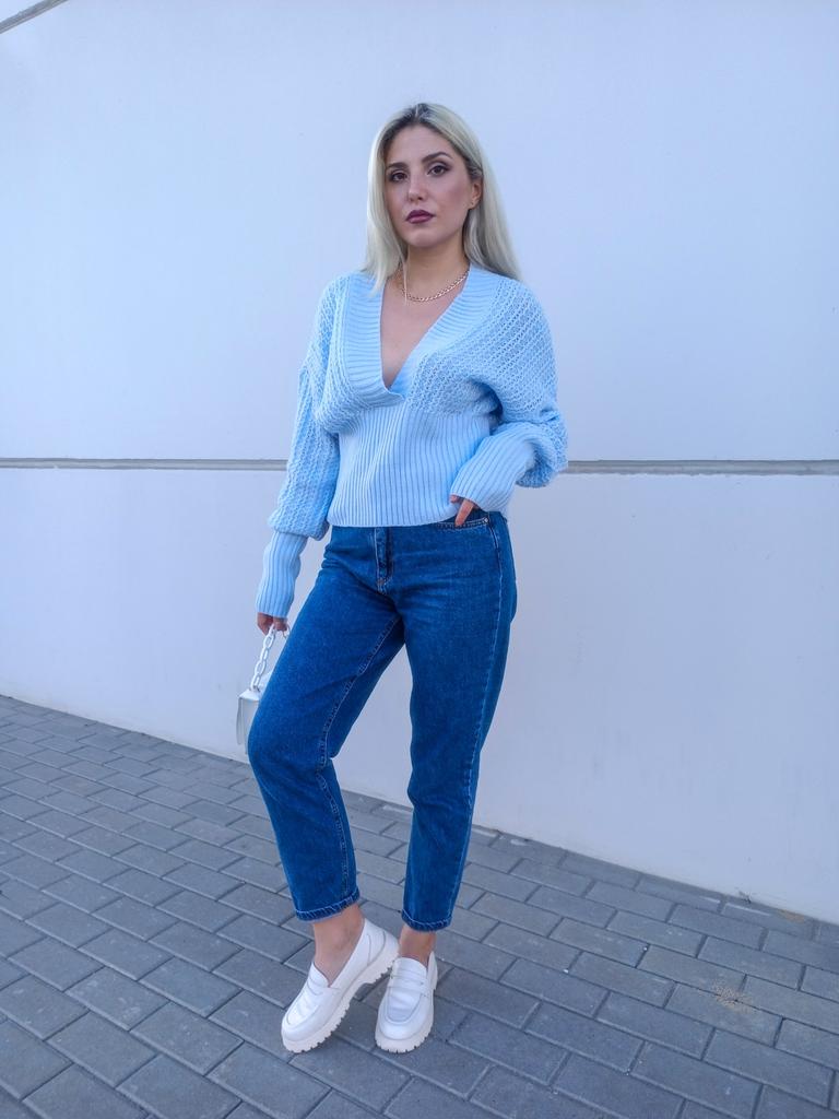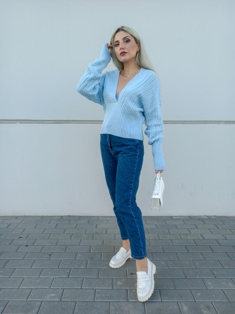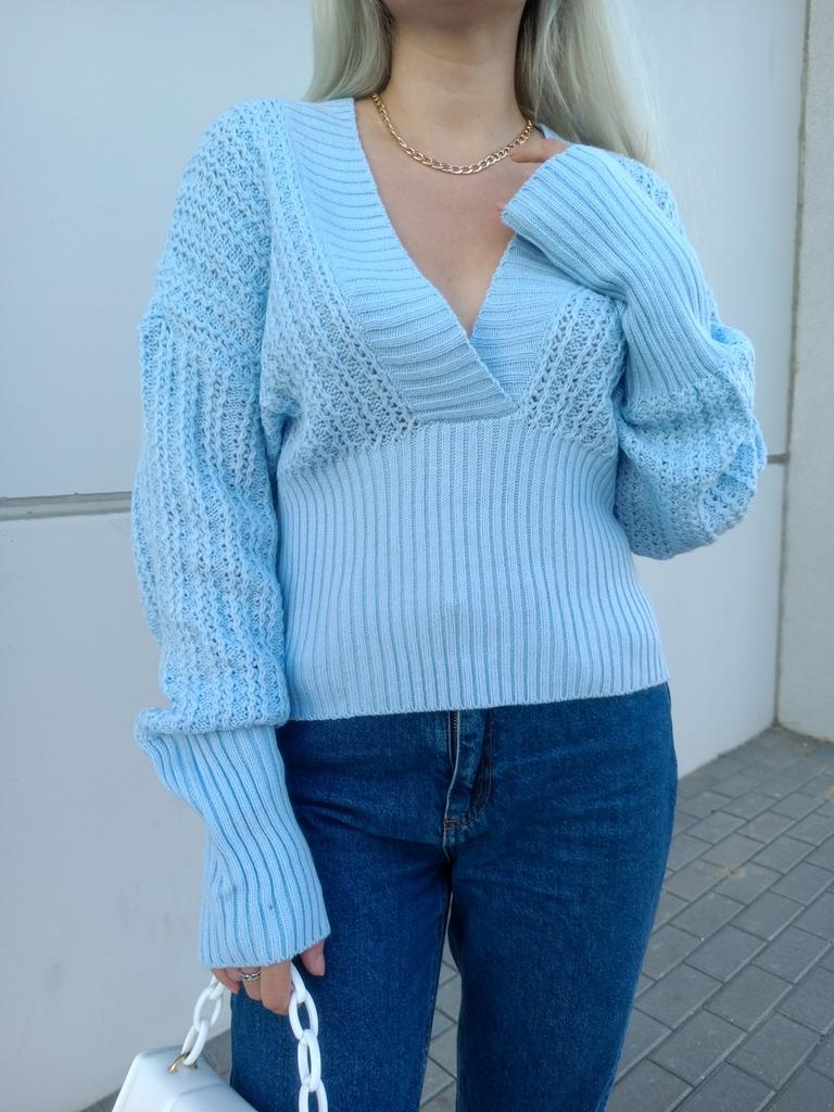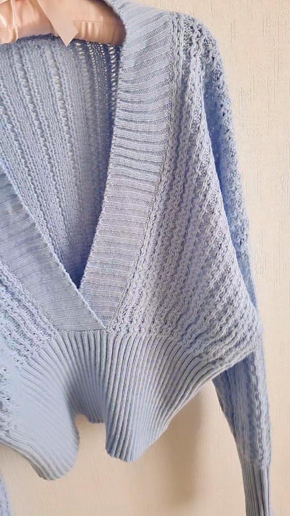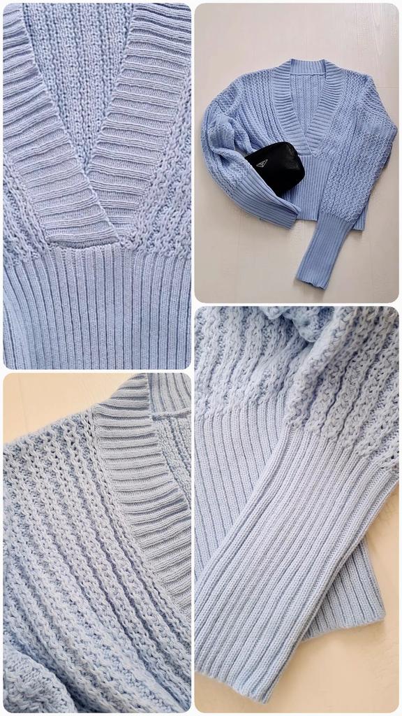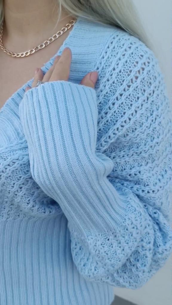 Beautiful bat sleeve knit sweater with a high waist and a deep V-neckline. Delivery timeโ๏ธ: 14 days to Germanyโ๏ธ๐ Scope of delivery:โ ๏ธThe scope of delivery includes a beautiful sweater with a V-neckline and batwing sleeves in the appropriate color and size. There are 3 colors to choose from: pink, blue, gray. It is available from size S to L. I ordered the product in size S in blue and am very satisfied with it. ๐๐๐๐ The top has a very nice quality, well made, does not smell of chemicals. Unfortunately the sweater is a bit big for me. I don't see any problem with that at all, I'll just give it away to my girlfriend. But the size is according to the size chart. Normally I wear dress size 36.(S). I am 167 cm tall. My measurements are 90-65-90cm. I weigh 55 kg. The sweater in size S fits a chest circumference of 105 cm. You have to have a bigger chest than mine๐๐๐ . I especially like the V-neckline and these beautiful batwing sleeves๐๐๐โ ๏ธ. I find it extraordinary and seductive. Material composition: 100% acrylic . Summary: A beautiful sweater that has an excellent quality .๐๐ Thank you Joom and the seller!! 5 Stars!โ๏ธโ๏ธโ๏ธโ๏ธ๐โ ๏ธ๐