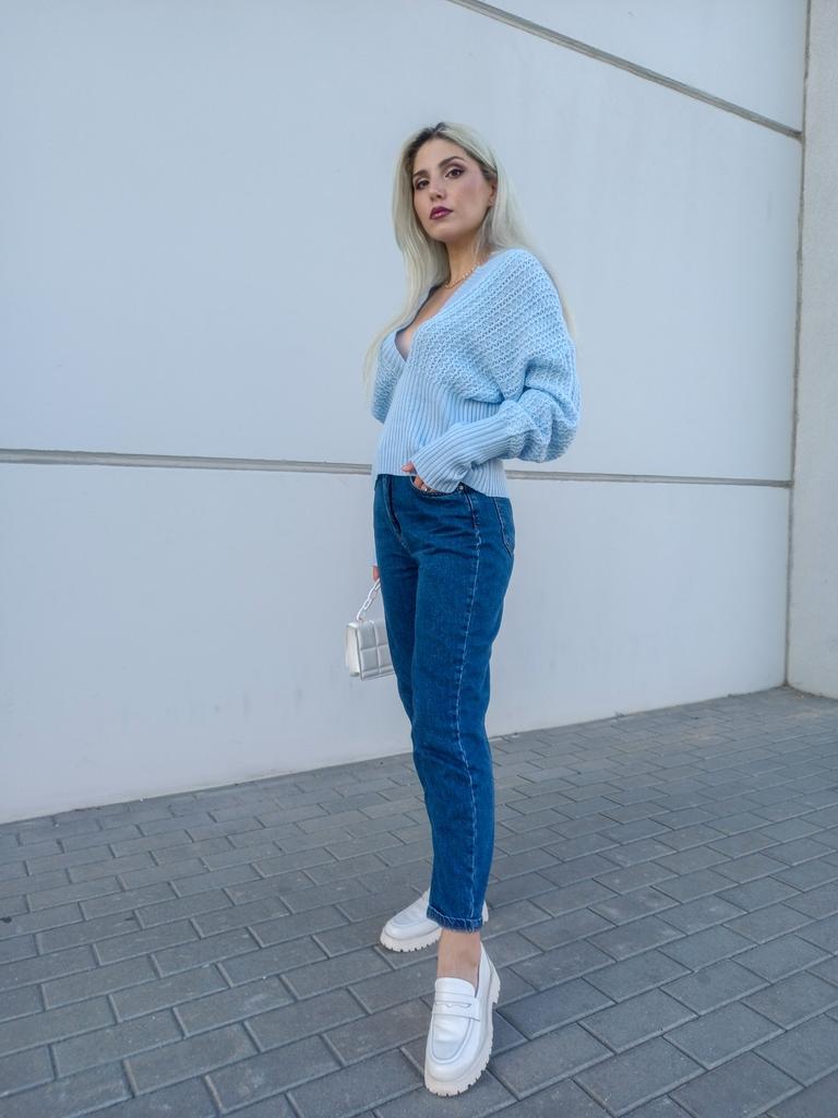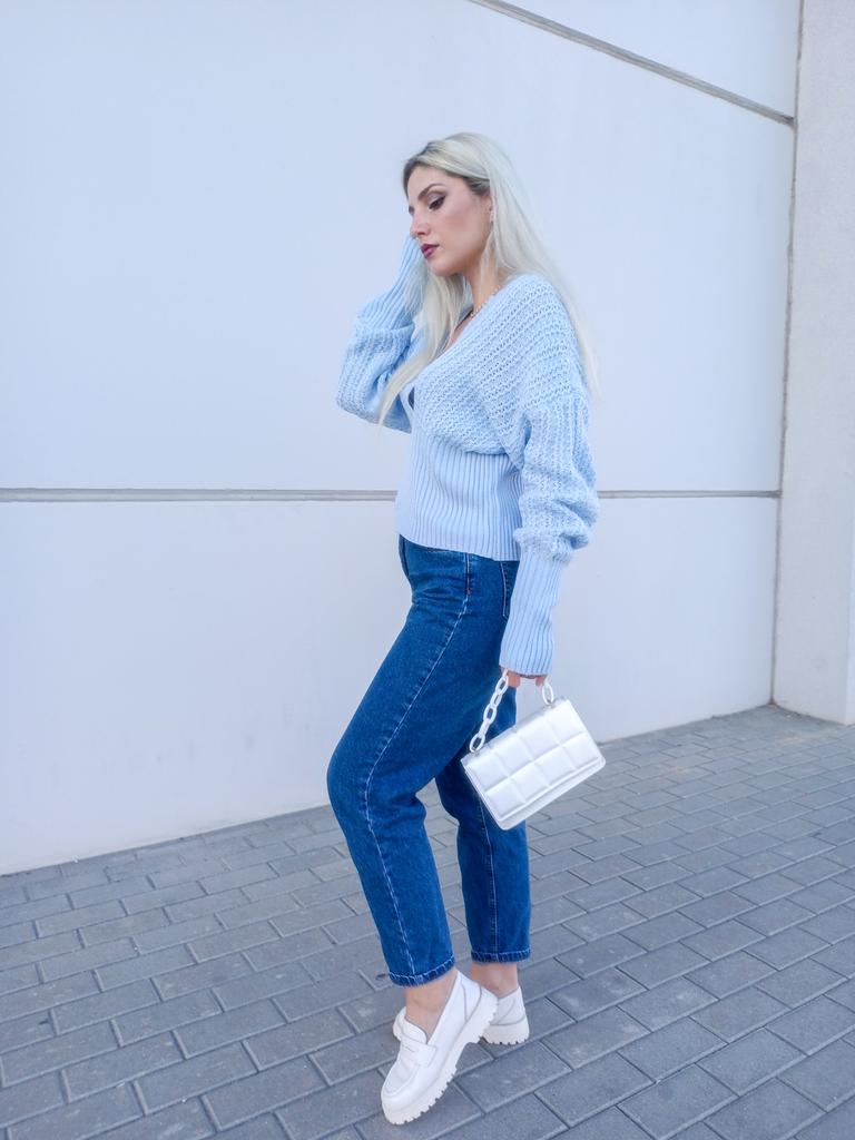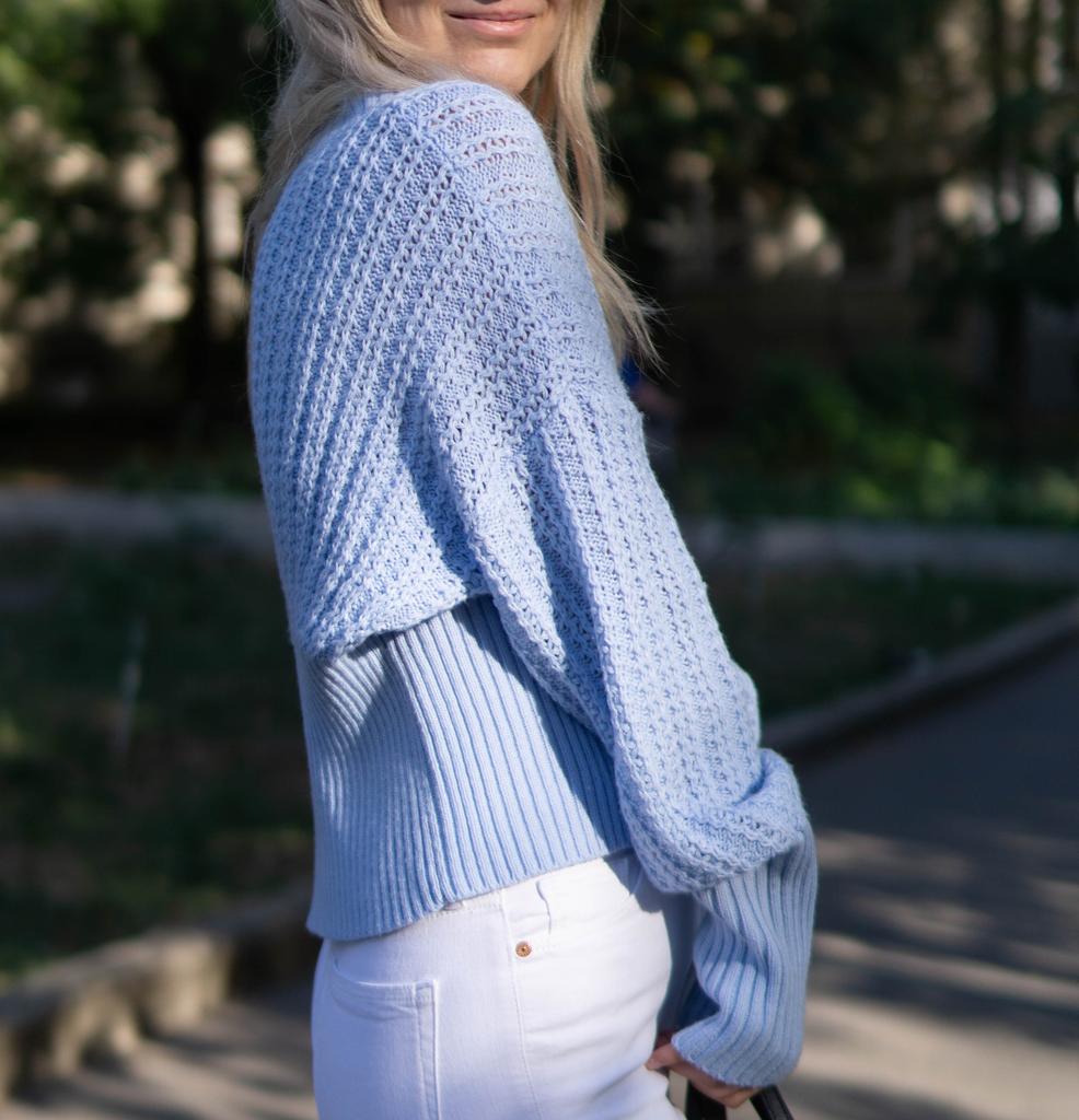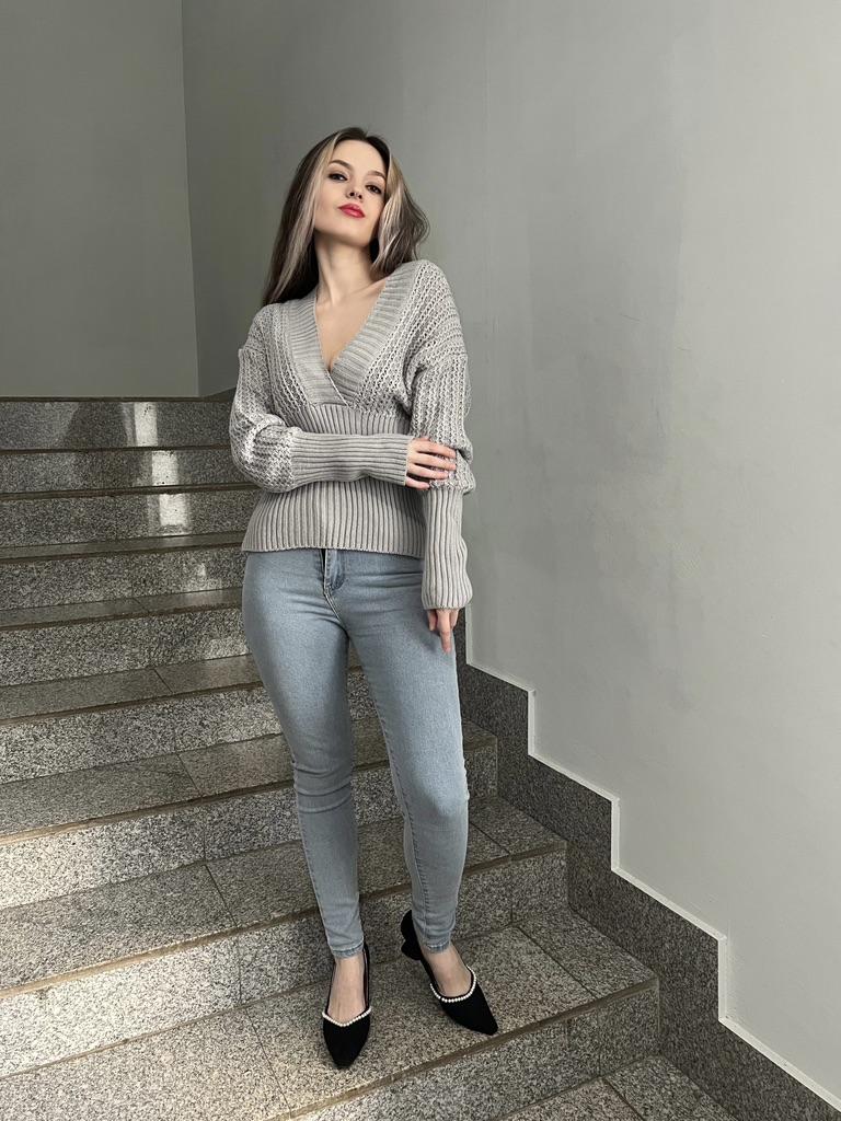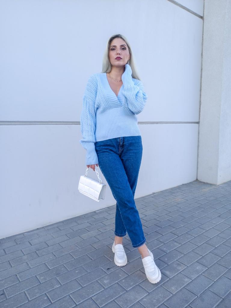 Beautiful bat sleeve knit sweater with a high waist and a deep V-neckline. Delivery timeโ๏ธ: 14 days to Germanyโ๏ธ๐ Scope of delivery:โ ๏ธThe scope of delivery includes a beautiful sweater with a V-neckline and batwing sleeves in the appropriate color and size. There are 3 colors to choose from: pink, blue, gray. It is available from size S to L. I ordered the product in size S in blue and am very satisfied with it. ๐๐๐๐ The top has a very nice quality, well made, does not smell of chemicals. Unfortunately the sweater is a bit big for me. I don't see any problem with that at all, I'll just give it away to my girlfriend. But the size is according to the size chart. Normally I wear dress size 36.(S). I am 167 cm tall. My measurements are 90-65-90cm. I weigh 55 kg. The sweater in size S fits a chest circumference of 105 cm. You have to have a bigger chest than mine๐๐๐ . I especially like the V-neckline and these beautiful batwing sleeves๐๐๐โ ๏ธ. I find it extraordinary and seductive. Material composition: 100% acrylic . Summary: A beautiful sweater that has an excellent quality .๐๐ Thank you Joom and the seller!! 5 Stars!โ๏ธโ๏ธโ๏ธโ๏ธ๐โ ๏ธ๐