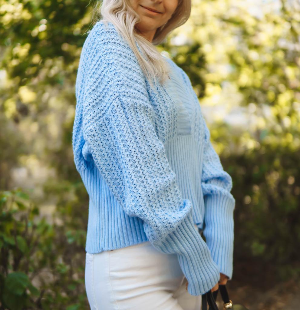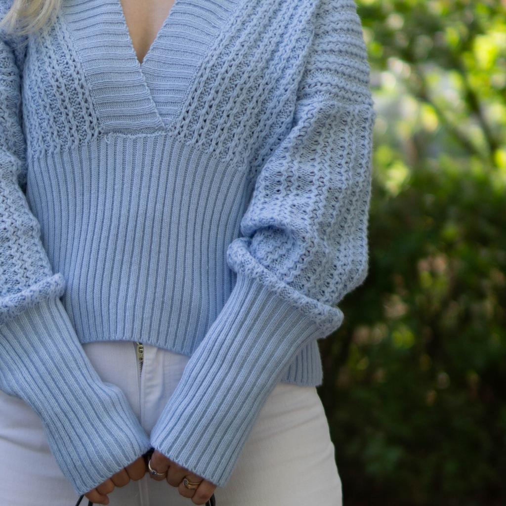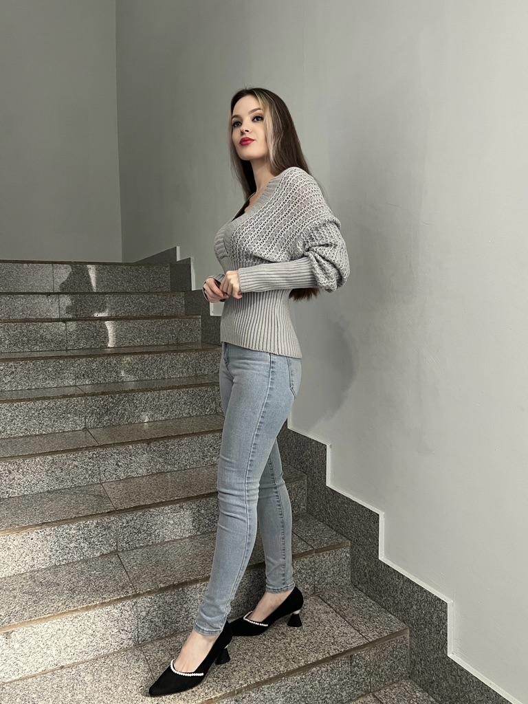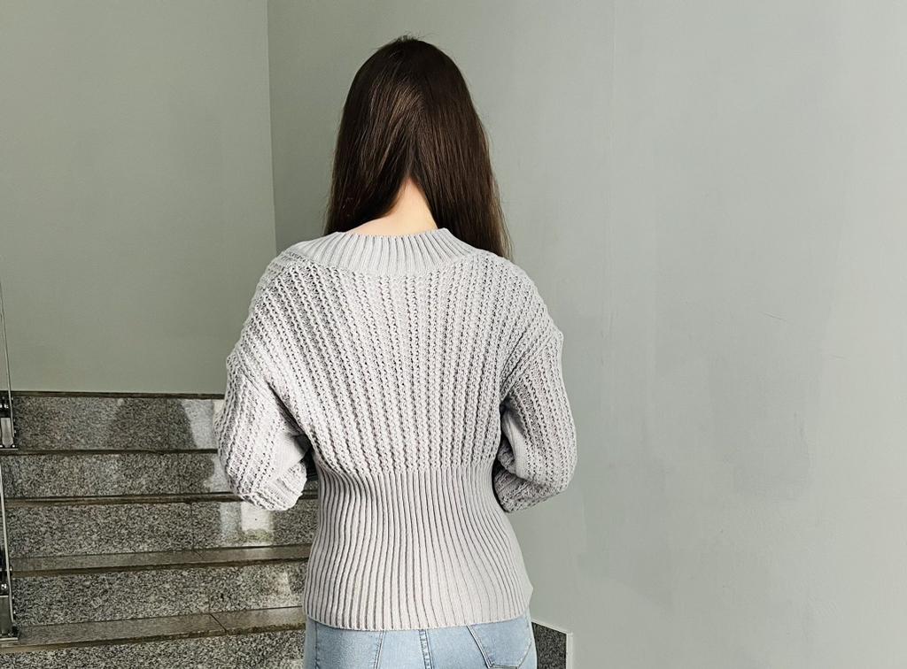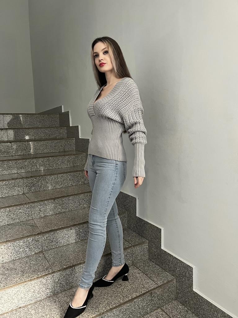 Beautiful bat sleeve knit sweater with a high waist and a deep V-neckline. Delivery timeโ๏ธ: 14 days to Germanyโ๏ธ๐ Scope of delivery:โ ๏ธThe scope of delivery includes a beautiful sweater with a V-neckline and batwing sleeves in the appropriate color and size. There are 3 colors to choose from: pink, blue, gray. It is available from size S to L. I ordered the product in size S in blue and am very satisfied with it. ๐๐๐๐ The top has a very nice quality, well made, does not smell of chemicals. Unfortunately the sweater is a bit big for me. I don't see any problem with that at all, I'll just give it away to my girlfriend. But the size is according to the size chart. Normally I wear dress size 36.(S). I am 167 cm tall. My measurements are 90-65-90cm. I weigh 55 kg. The sweater in size S fits a chest circumference of 105 cm. You have to have a bigger chest than mine๐๐๐ . I especially like the V-neckline and these beautiful batwing sleeves๐๐๐โ ๏ธ. I find it extraordinary and seductive. Material composition: 100% acrylic . Summary: A beautiful sweater that has an excellent quality .๐๐ Thank you Joom and the seller!! 5 Stars!โ๏ธโ๏ธโ๏ธโ๏ธ๐โ ๏ธ๐