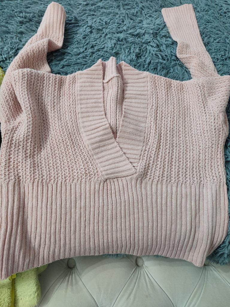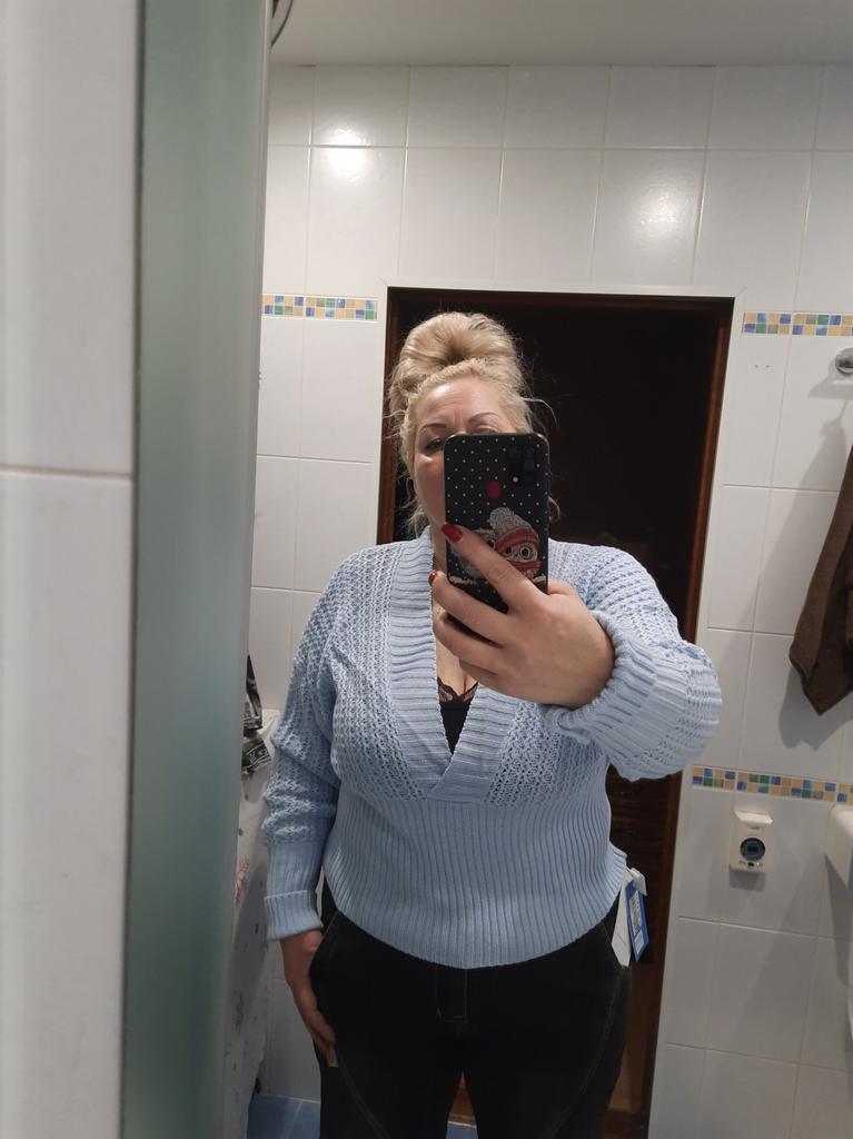 *V-neck sweater* ๐ฅ๐๐ถ๐ฒ๐ณ๐ฒ๐ฟ๐๐ฒ๐ถ๐ About a week ๐ฅ๐๐ถ๐ฒ๐ณ๐ฒ๐ฟ๐๐บ๐ณ๐ฎ๐ป๐ด The scope of delivery includes 1 sweater in the appropriate color and size. It is available in 3 different colors (gray, pink and blue) in sizes S to L. I ordered the sweater in size S in pink. I wear size 36 to 38. I weigh 62 kg over 172 cm. Cup size 75D. The sweater is definitely too big for me, even though yours is already the smallest size It's very stretchy. ๐ฅ๐ค๐๐ฎ๐น๐ถ๐รค๐ The sweater is opaque. If the sweater were the right size, it would have a nice fit. I say the sweater fits size L. I particularly like the knitted look. The dรฉcolletรฉ is beautifully accentuated. For material composition : 100% acrylic ๐ฅ๐๐ฎ๐๐ถ๐ Actually a very nice sweater if it had been delivered in the right size ๐ Size S is more like size L ... Otherwise it doesn't smell unpleasantly of chemicals and would have a nice fit.