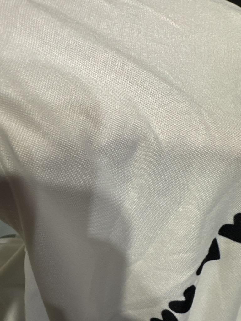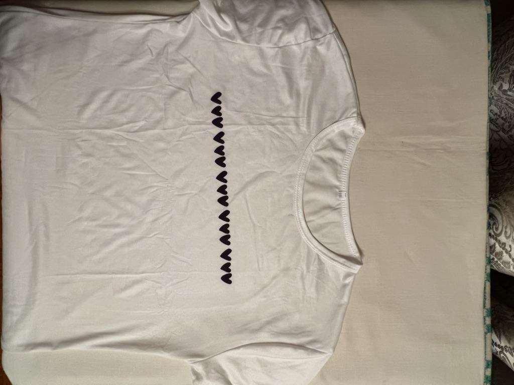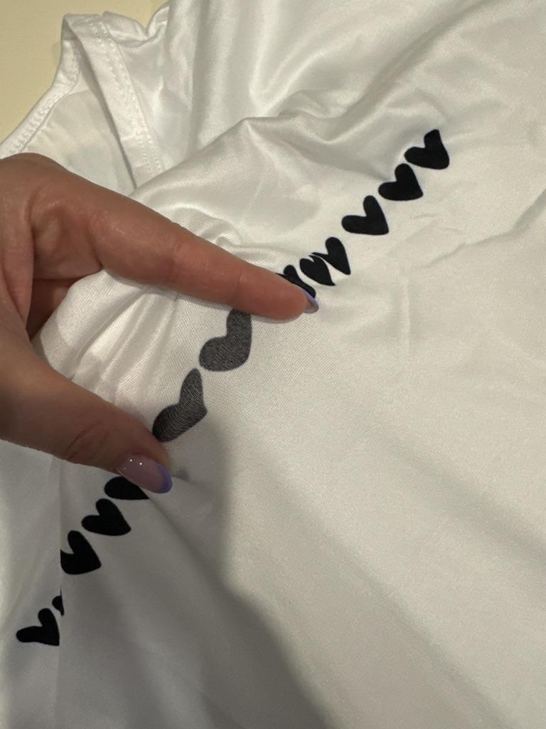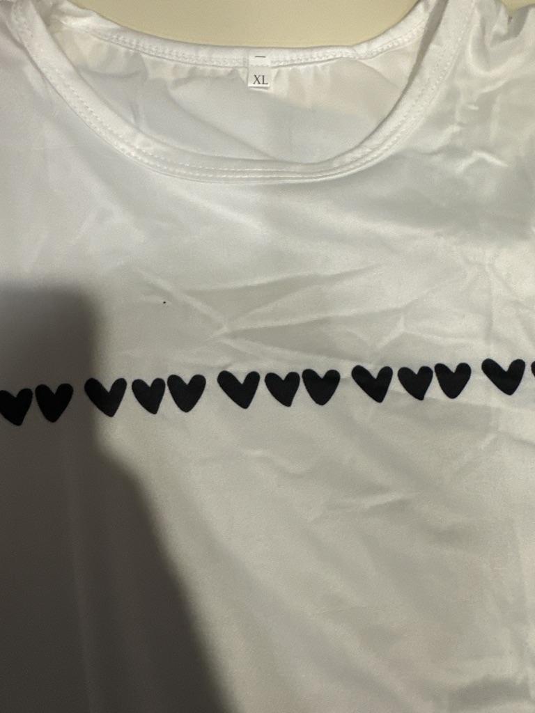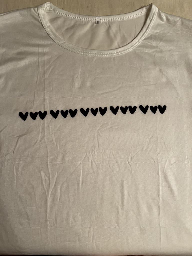 The hearts are positioned crookedly. Damaged T-shirt.