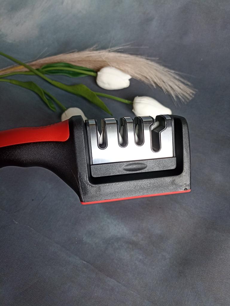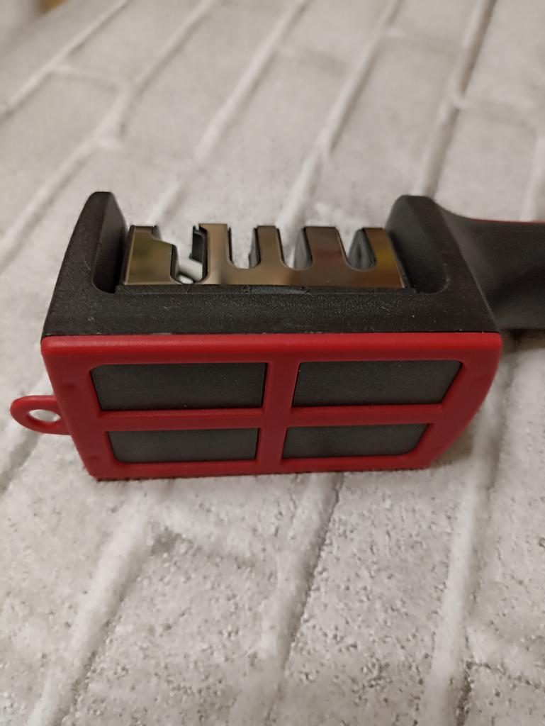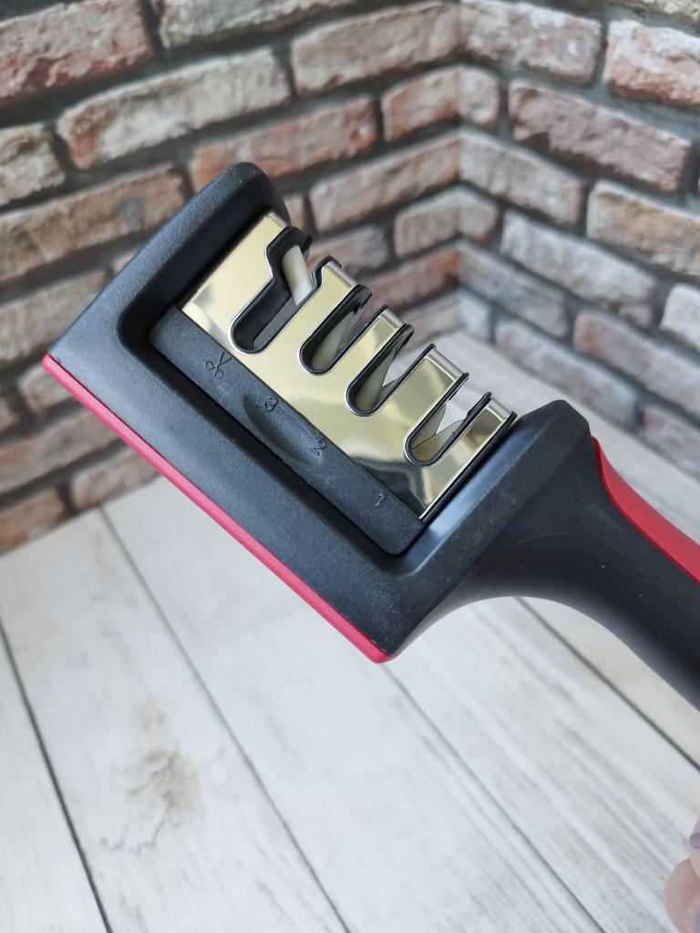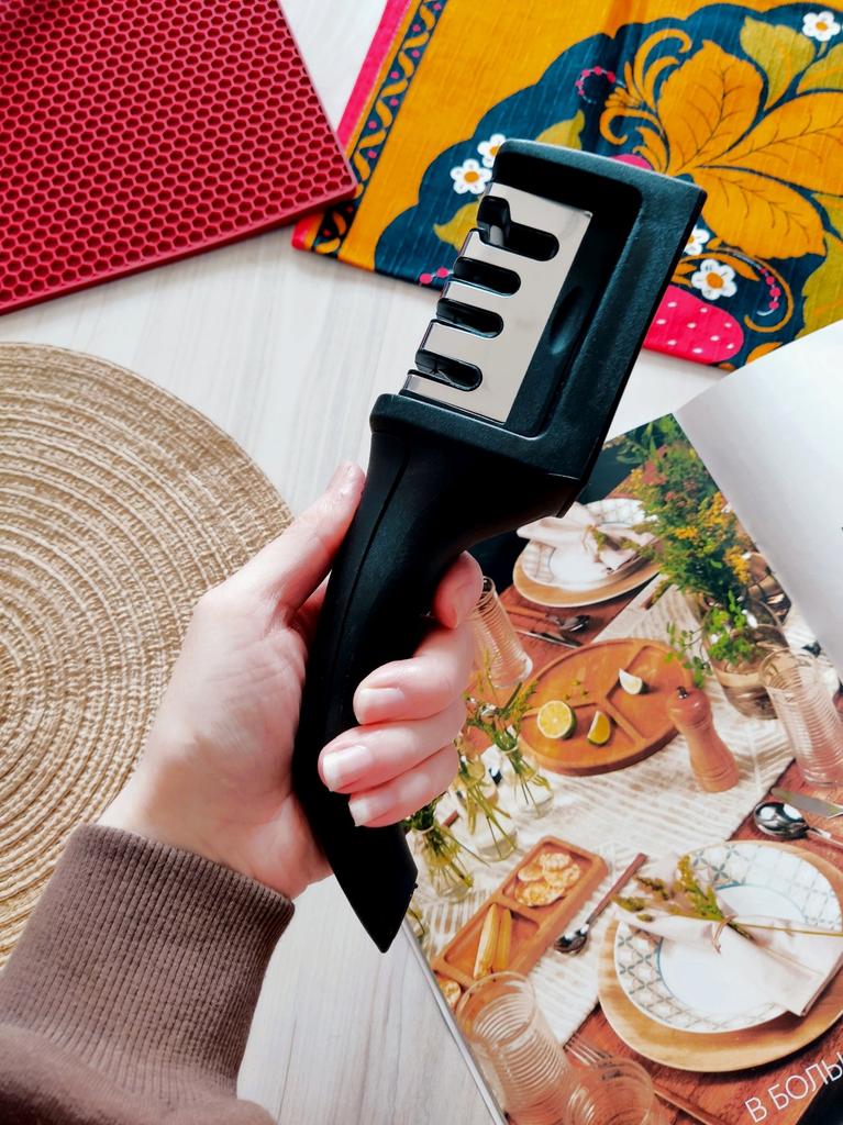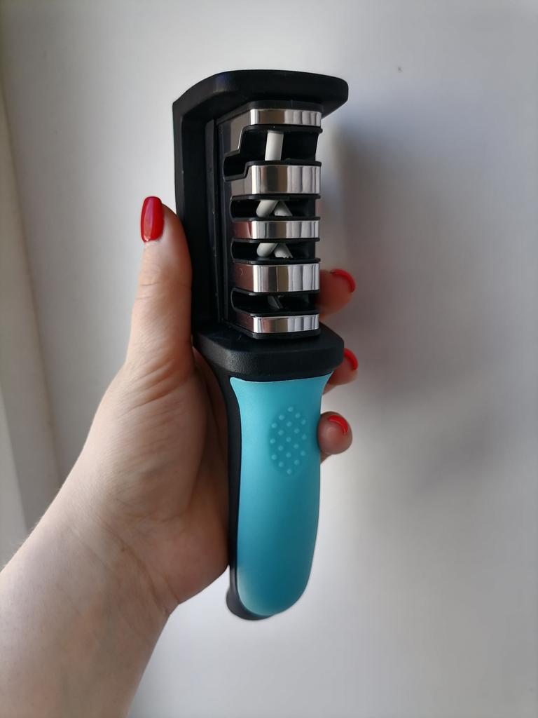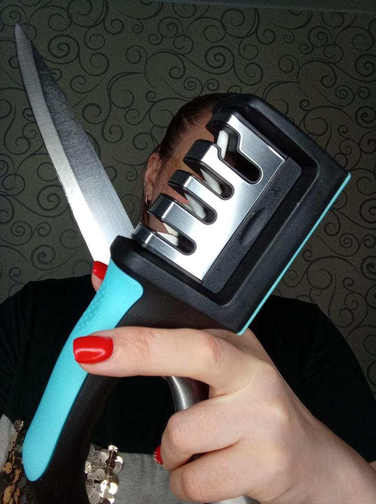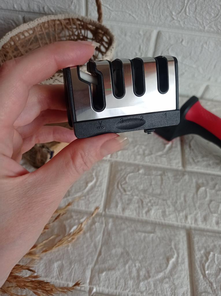 UNIVERSAL MANUAL SHARPENER FOR KNIVES AND SCISSORS👍 Has four slots for sharpening. The first slot is intended for coarse sharpening of knives, the second - for medium, the third - for fine. Fourth slot for sharpening scissors. It has a compact size and light weight, made of durable ABS plastic. The body has an ergonomic handle with a comfortable hand grip, a removable sharpening slot, and rubberized inserts on the bottom that prevent the device from sliding on the surface.. Completely easy to use, you just need to place the blade in the slot with the tip pointing down, swiping it towards you several times. Great sharpener👌 Recommend⭐