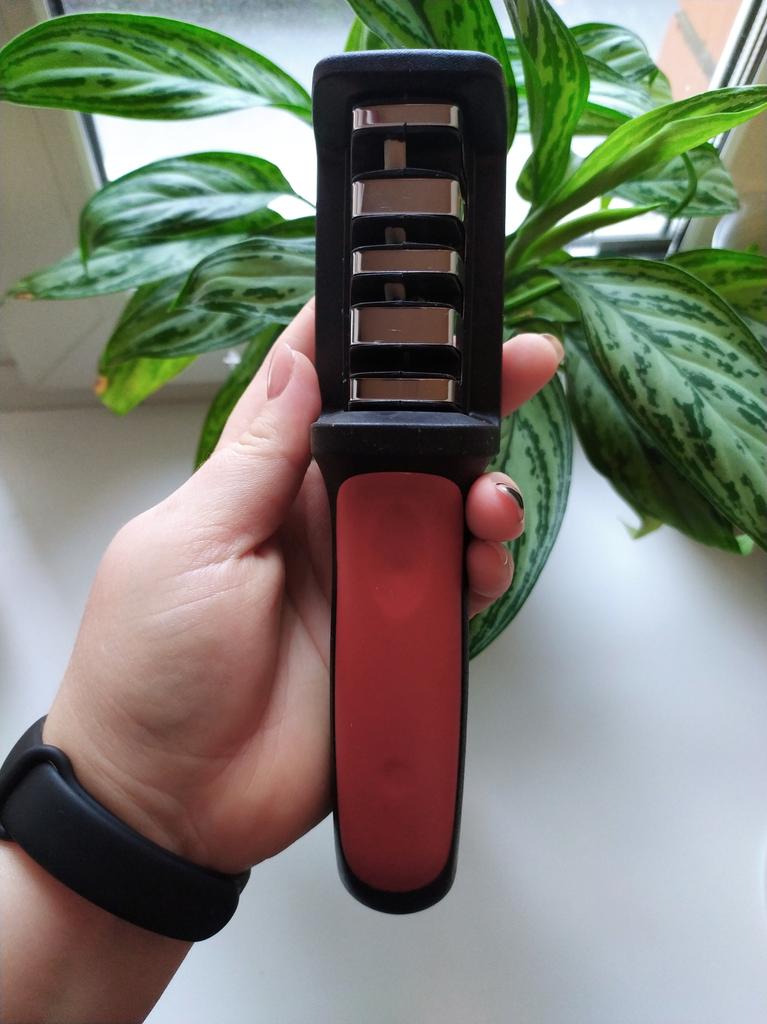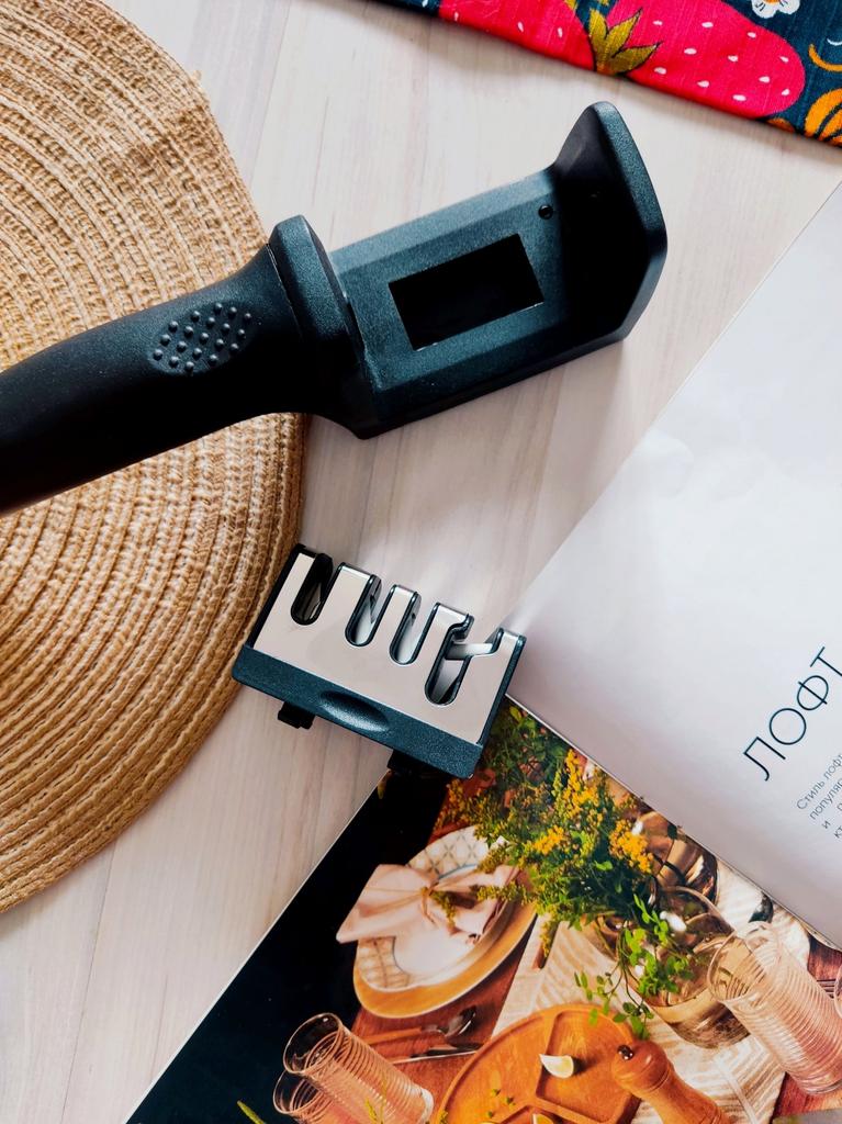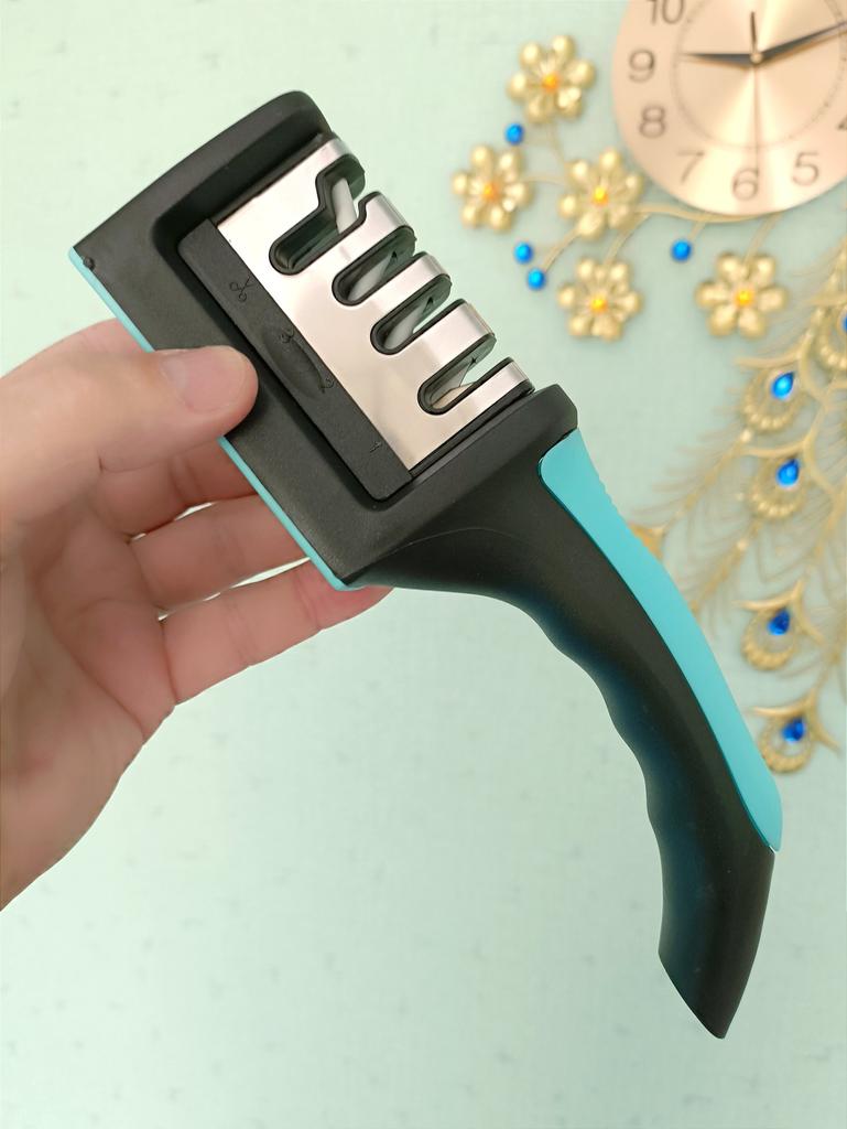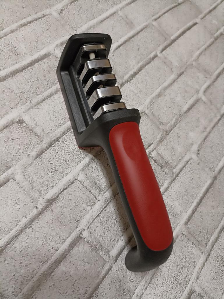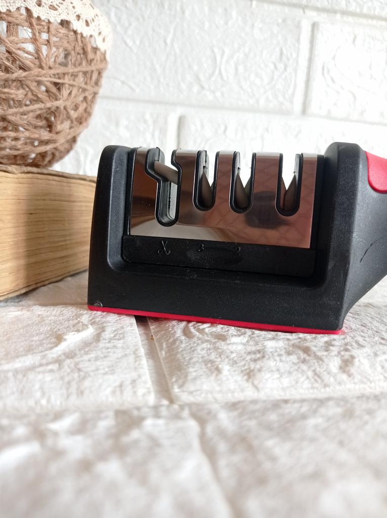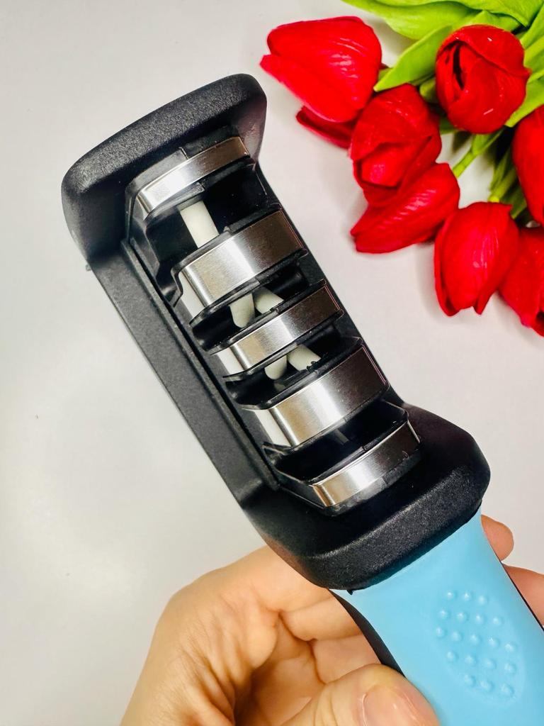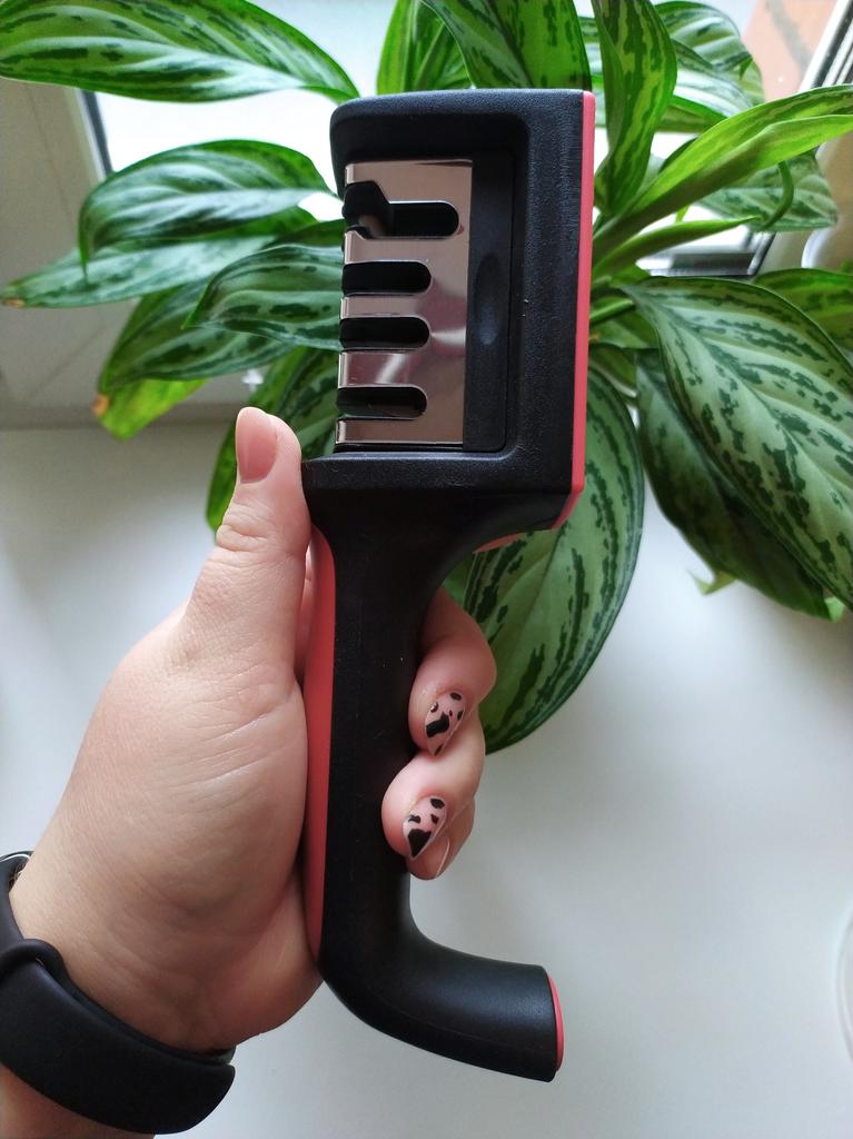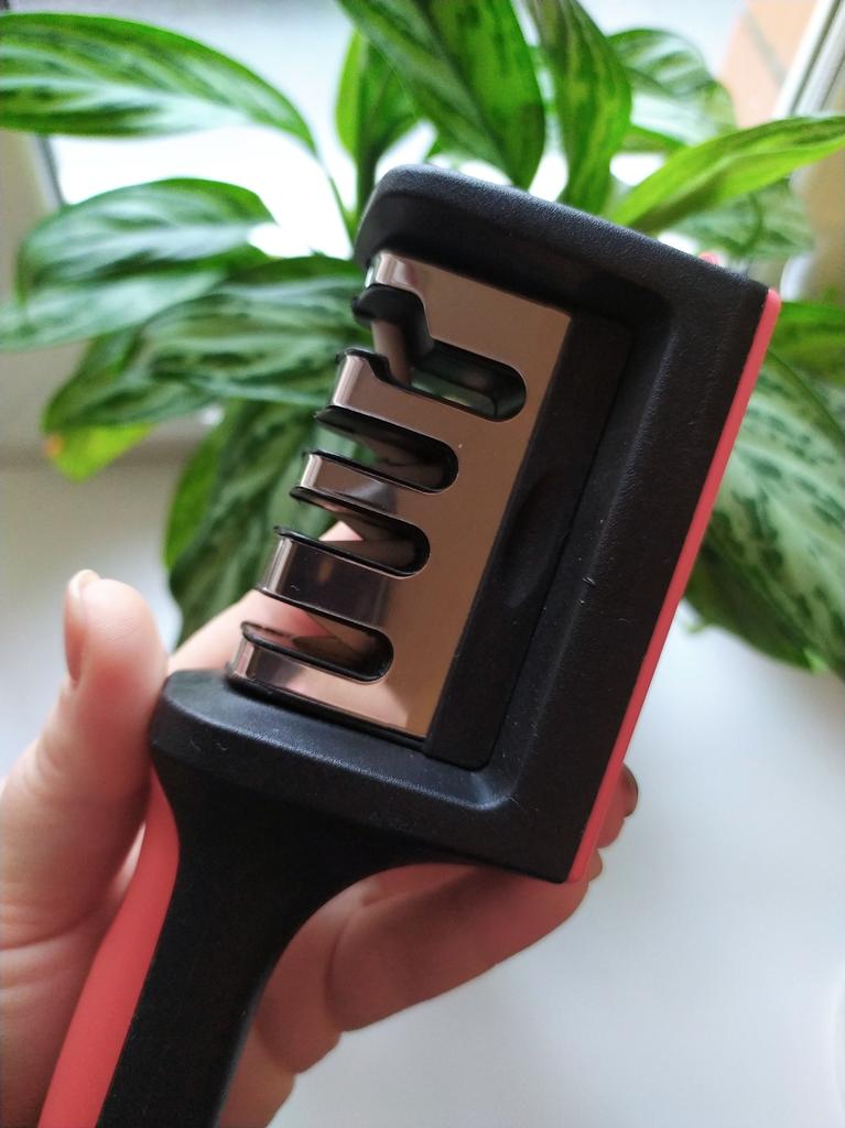 UNIVERSAL MANUAL SHARPENER FOR KNIVES AND SCISSORS👍 Has four slots for sharpening. The first slot is intended for coarse sharpening of knives, the second - for medium, the third - for fine. Fourth slot for sharpening scissors. It has a compact size and light weight, made of durable ABS plastic. The body has an ergonomic handle with a comfortable hand grip, a removable sharpening slot, and rubberized inserts on the bottom that prevent the device from sliding on the surface.. Completely easy to use, you just need to place the blade in the slot with the tip pointing down, swiping it towards you several times. Great sharpener👌 Recommend⭐
