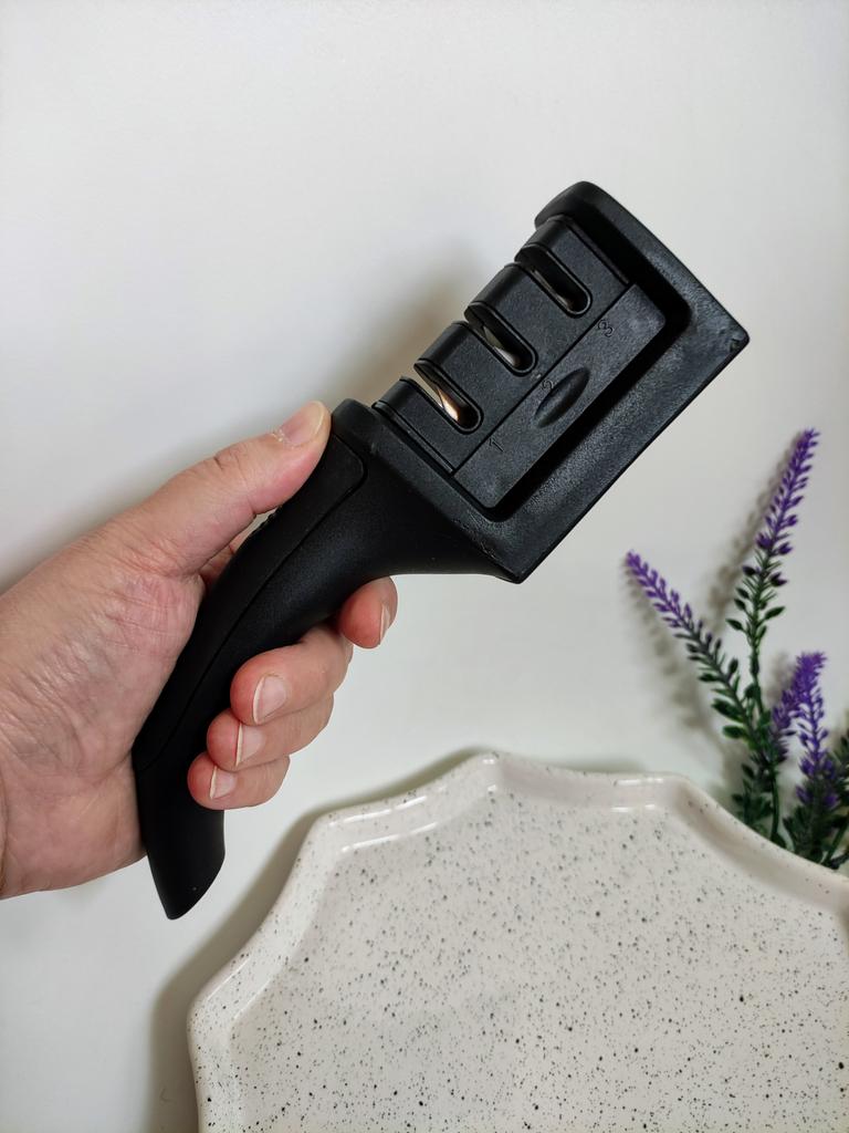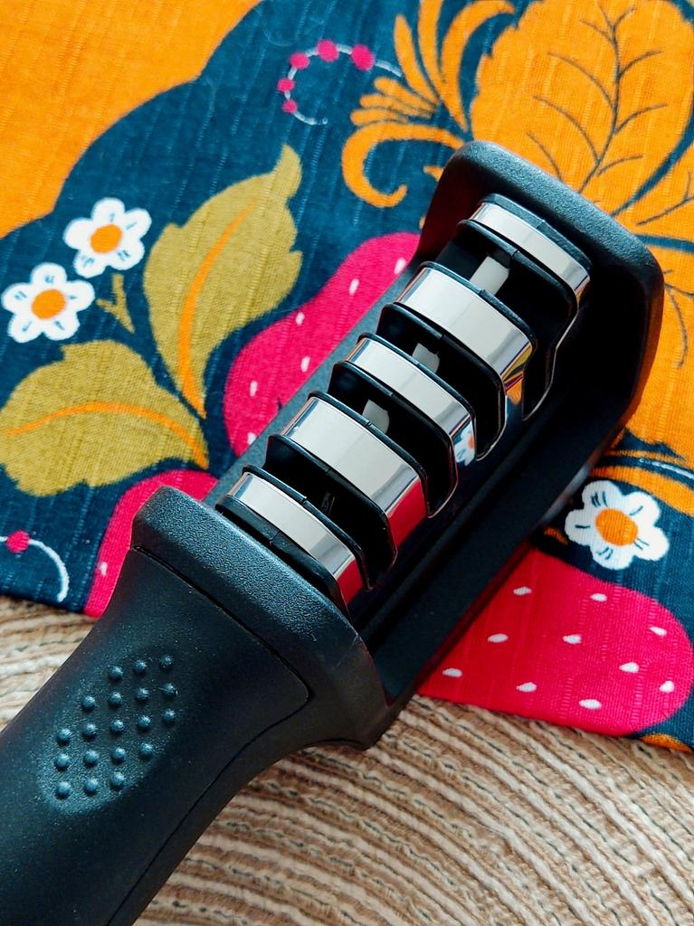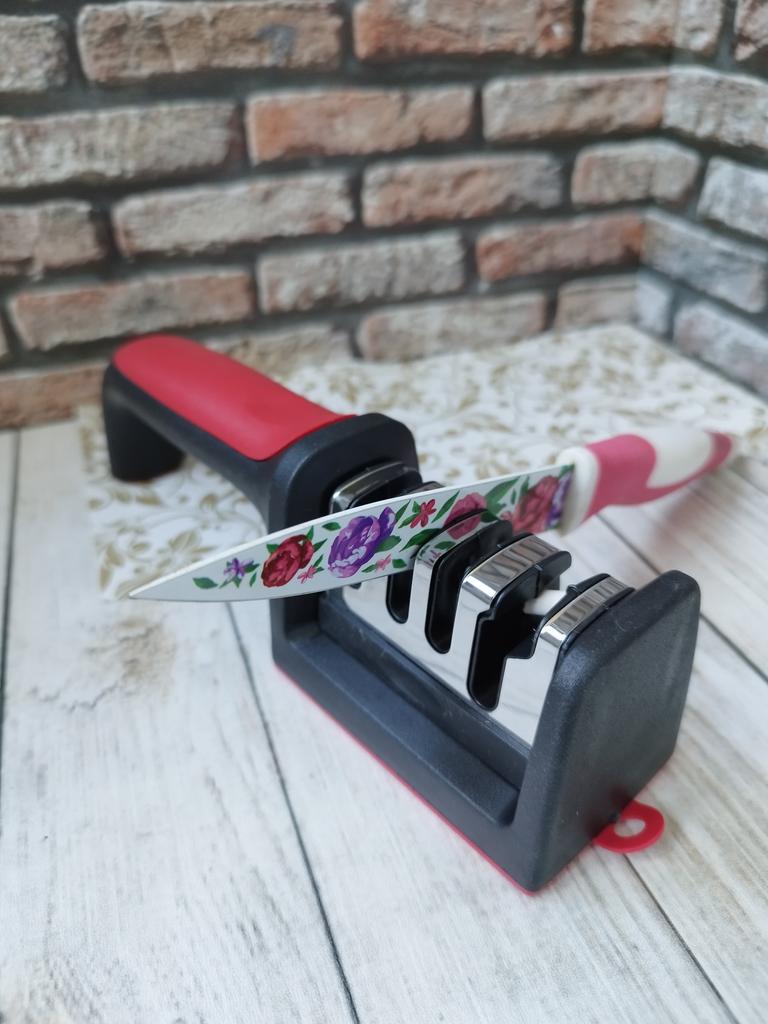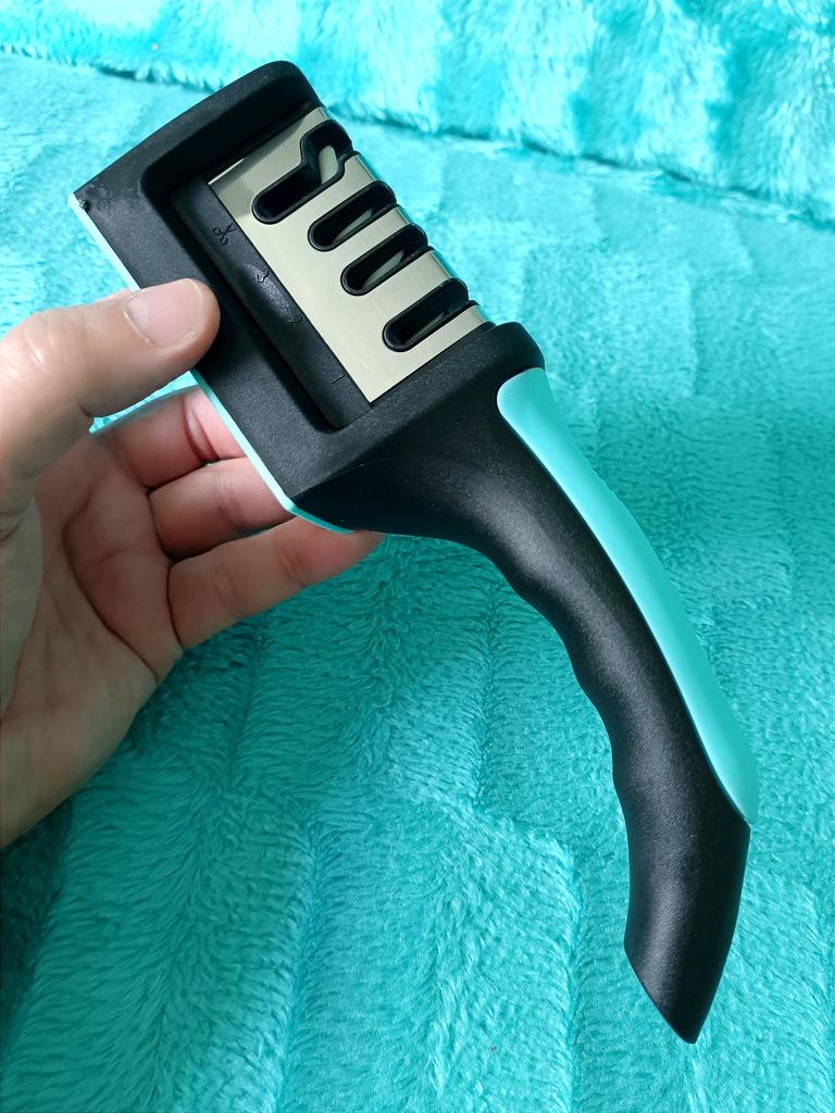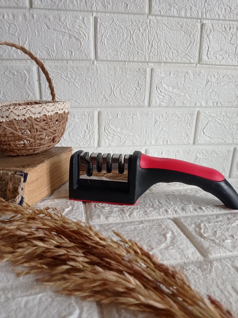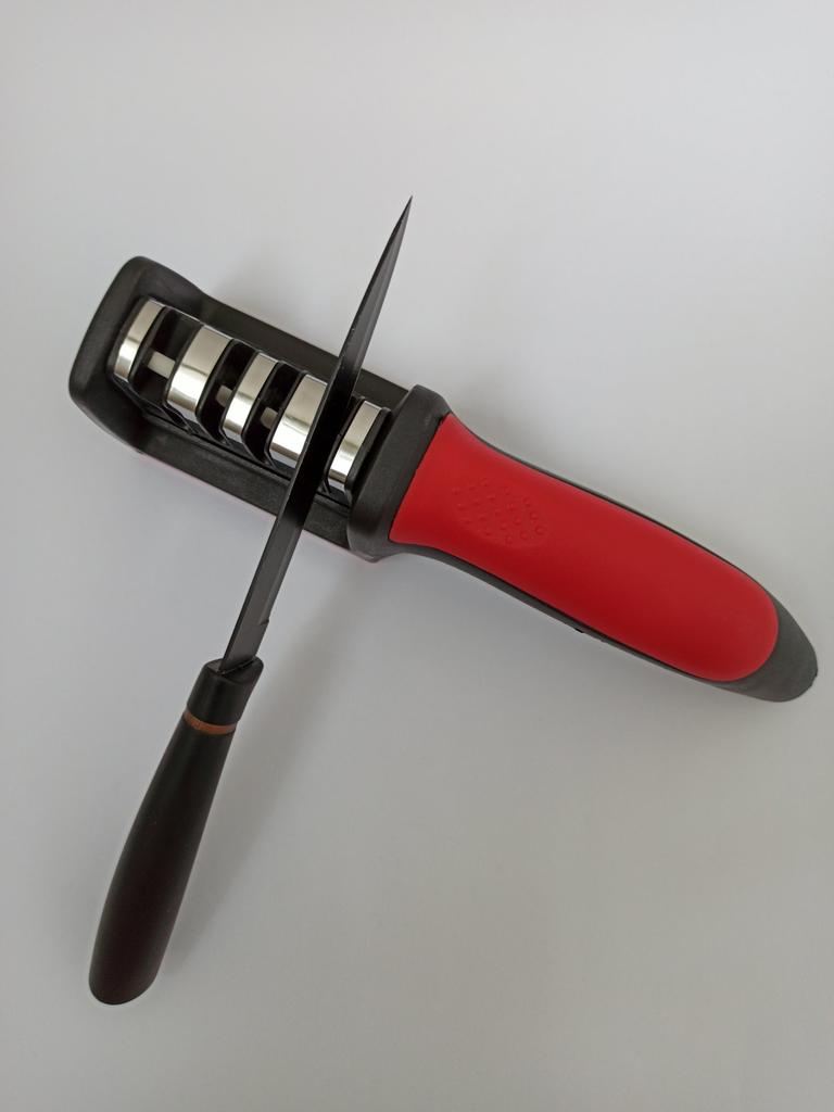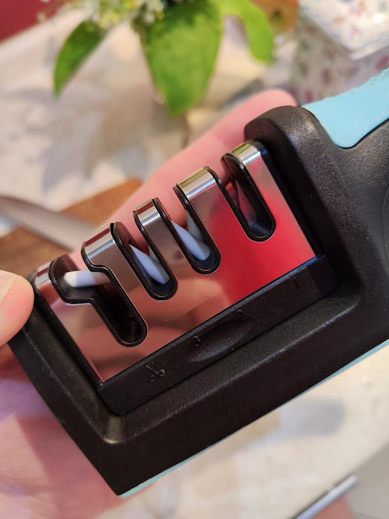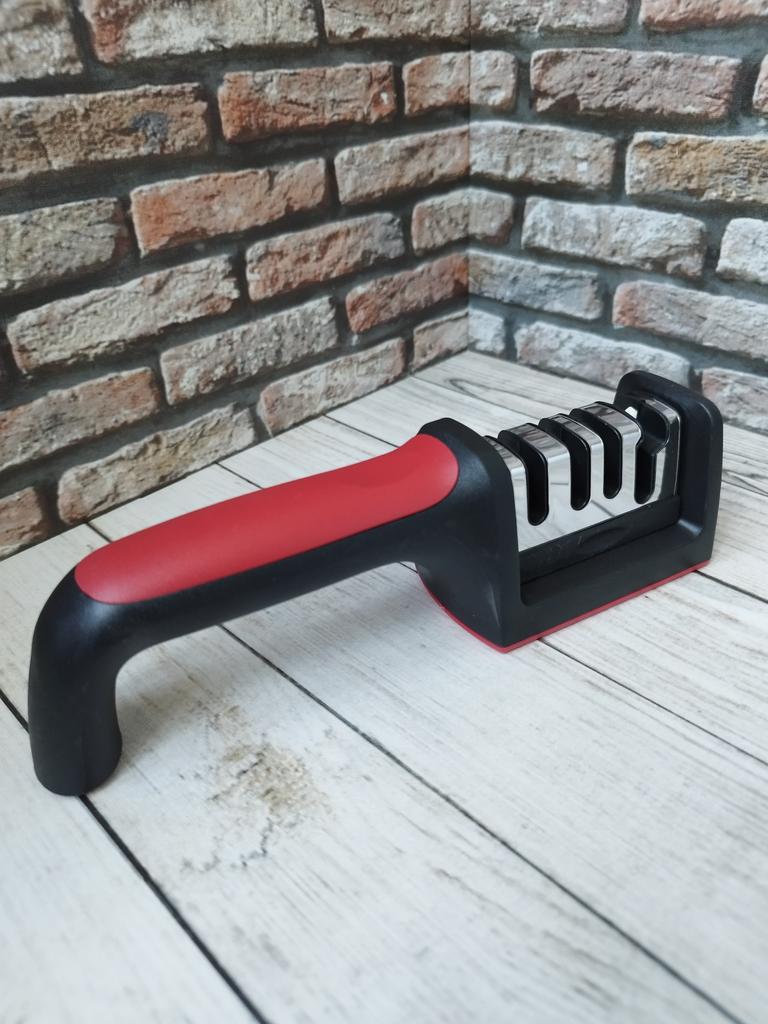 UNIVERSAL MANUAL SHARPENER FOR KNIVES AND SCISSORS👍 Has four slots for sharpening. The first slot is intended for coarse sharpening of knives, the second - for medium, the third - for fine. Fourth slot for sharpening scissors. It has a compact size and light weight, made of durable ABS plastic. The body has an ergonomic handle with a comfortable hand grip, a removable sharpening slot, and rubberized inserts on the bottom that prevent the device from sliding on the surface.. Completely easy to use, you just need to place the blade in the slot with the tip pointing down, swiping it towards you several times. Great sharpener👌 Recommend⭐