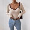 GMXIA Spring and Autumn Fashion Wrap Edge V-neck Knitwear Women's Vertical Grain Pit Strip Slimming Bottoms