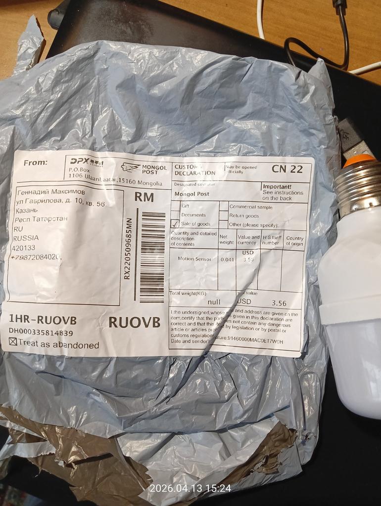 I received the order very quickly. The light bulb was screwed into the vestibule. It works, but as I understood, it reacts not to movement, but to a sharp sound when you slam the door hard... and so, in principle, it works normally, shines with bright white light, turns off on its own:))