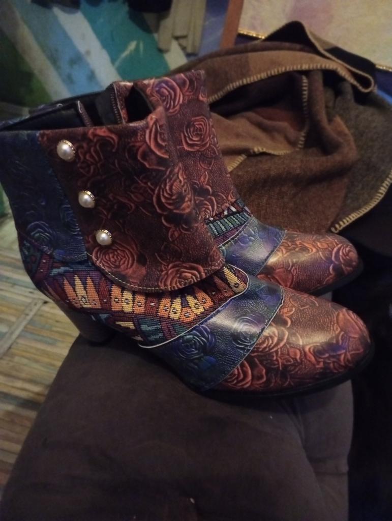 Fashion Vintage Splicing Printed Ankle Boots for Women Shoes Female PU Leather Retro Block High Heels Bohemian Ladies Winter Short Boots