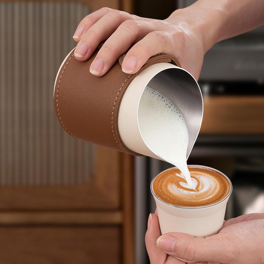 - 【Convenient Features】: The stainless steel latte art cup has scale markings on the inside, allowing you to easily control the measurement. It also includes a vintage PU leather cover for heat insulation and scalding protection