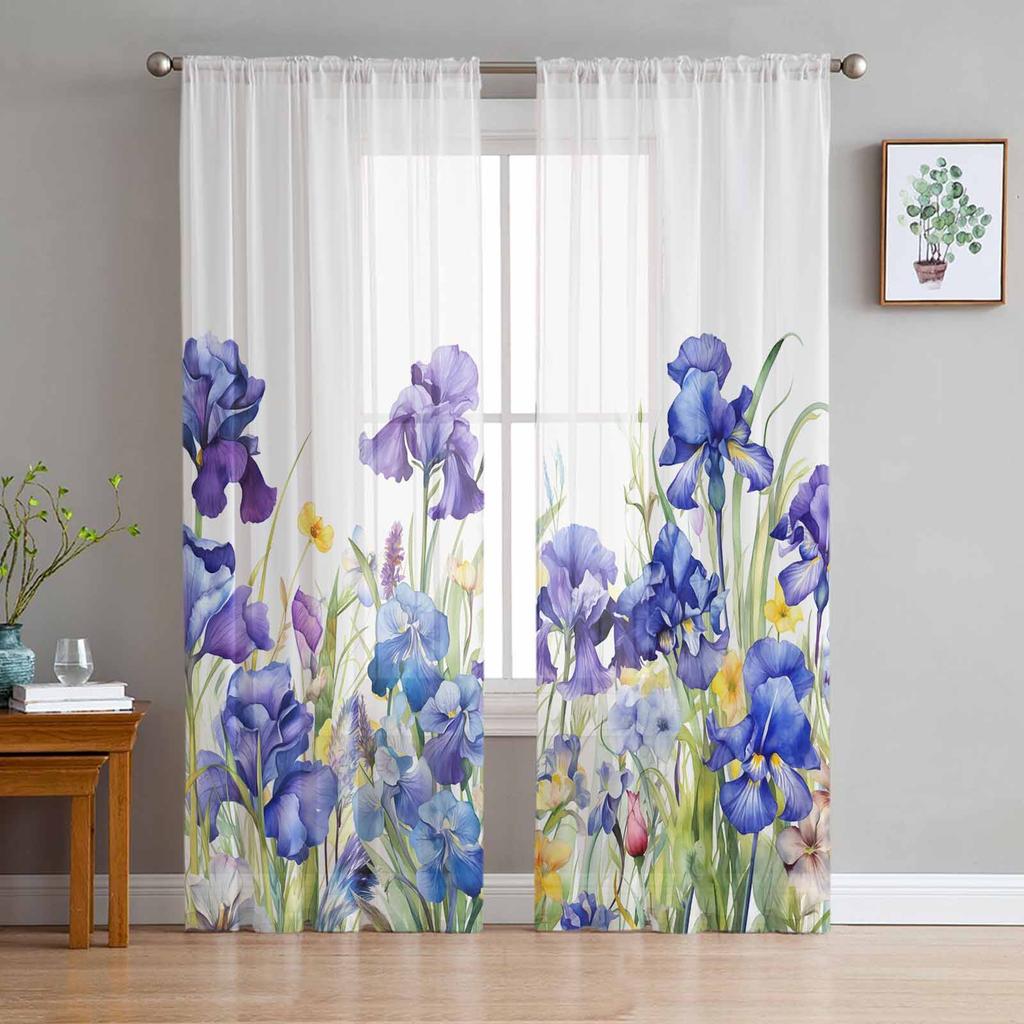 Iris Flower Watercolor Sheer Curtains for Living Room Decoration Window Curtains for Kitchen Tulle Voile Organza Curtains