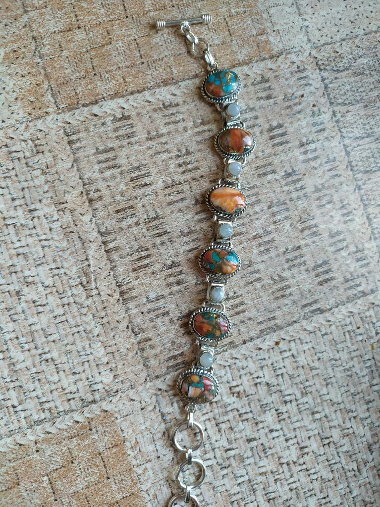 Orange Spiny Oyster, Moonstone Adjustable 925 Sterling Silver Bracelet, Boho Silver Jewelry Bracelet, Gifts For Valentine Gifts For Her