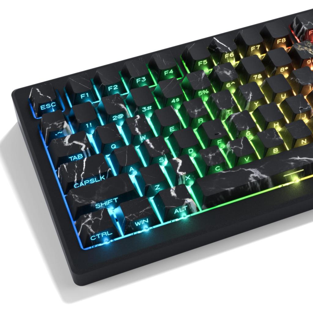 "Sublimated PBT Keycaps" There are slightly matte particles on the surface of the PBT keycaps, making it easier for your fingers to fit into the keycaps. This black marble pattern keycap has a matte texture and oil-resistant coating, which makes it wear-resistant, and heat sublimation technology ensures that the pattern on the keycap will never fade.