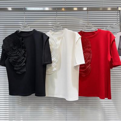 Summer New Women's Cotton T-shirts Short Sleeve Tops Trendy Elegant 3D Flower Designer Tees