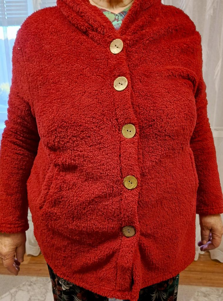 Firstly, this thing has no shape, it looks like some kind of shapeless banana sweater with beautiful buttons on the front, but it doesn't have the shape like in the photo. It's warm, yes, but very small and awkward, so I don't even know what to say, a little bit