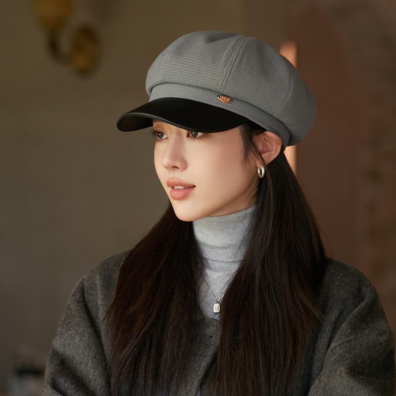 Autumn and Winter Hats Women's High-end Small Gold Standard Leather Hat Brim Octagonal Hat Literary Temperament Retro Newsboy Hat New