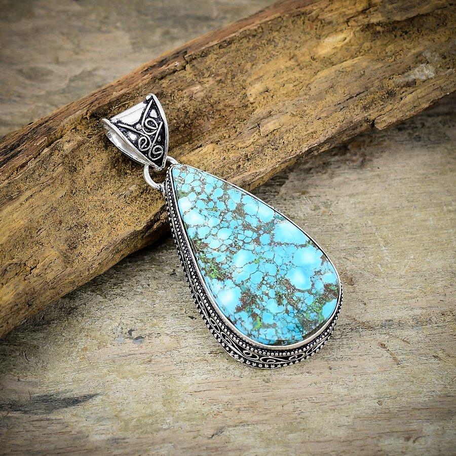 Tibetan Turquoise Gemstone 925 Sterling Silver Jewelry Pendant 2.25" M-170