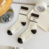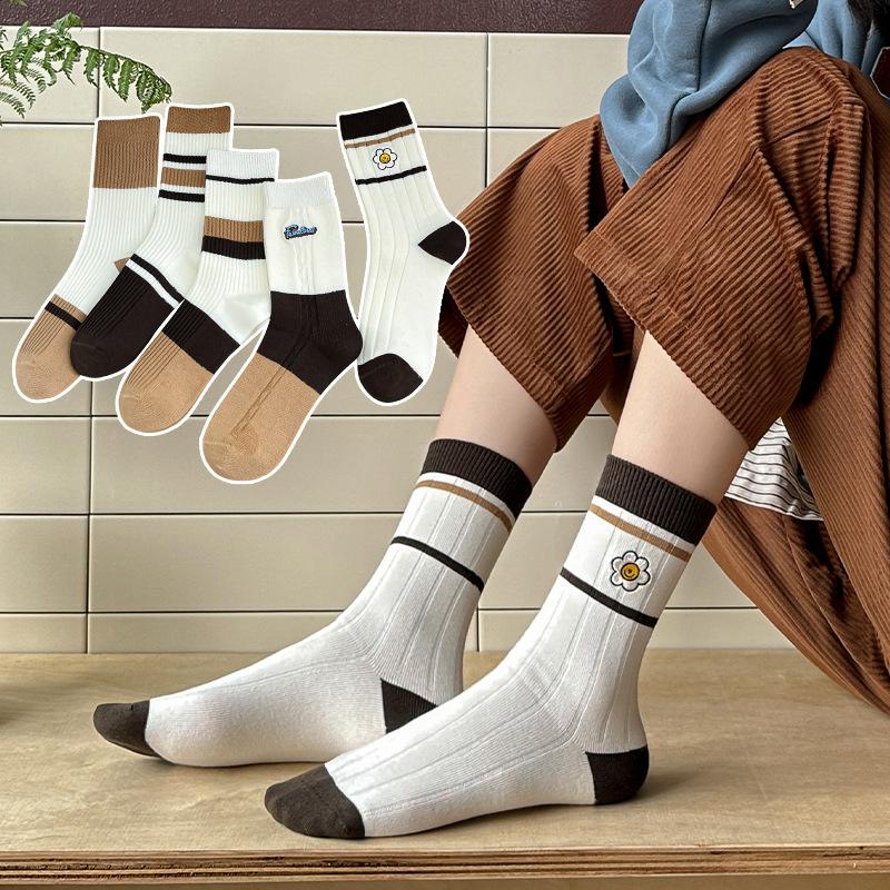 Female Spring and Autumn Pure Color Cotton Striped Embroidered Small Flower Boneless Long Tube Stack Socks
