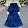 French Style Retro Minority Print Dress Female 2024 Autumn Lace-up Waist-Controlled Round Neck Lantern Sleeve Slimming Long Dress