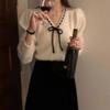 Spring and Autumn Bow Tie V-neck Long-sleeved Knitted Sweater, Gentle White Women's Loose All-match Top 6738#