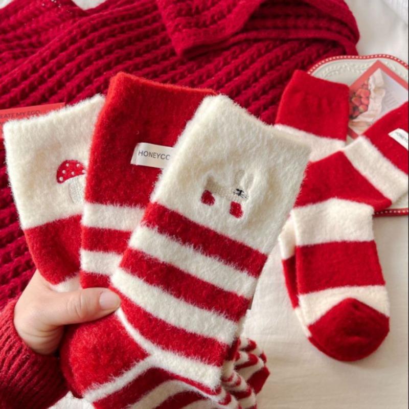 Female Winter Velvet Thickened Warm This Year Embroidered Mushroom Red Sleep Socks