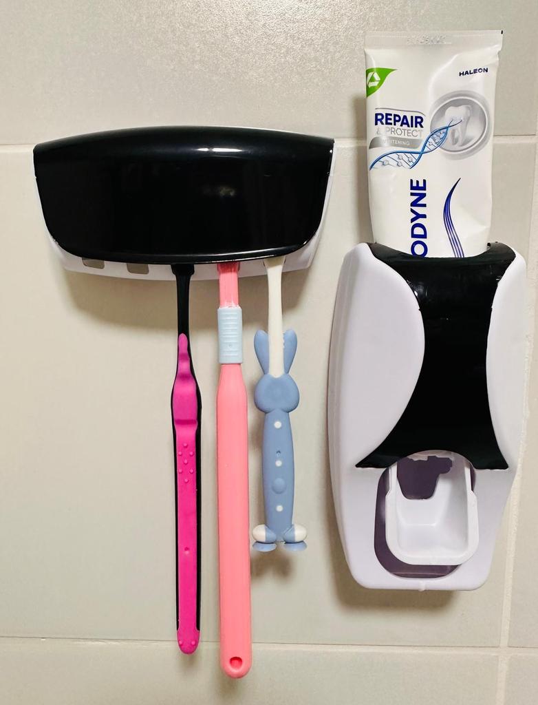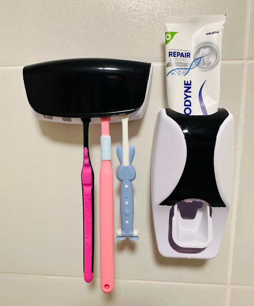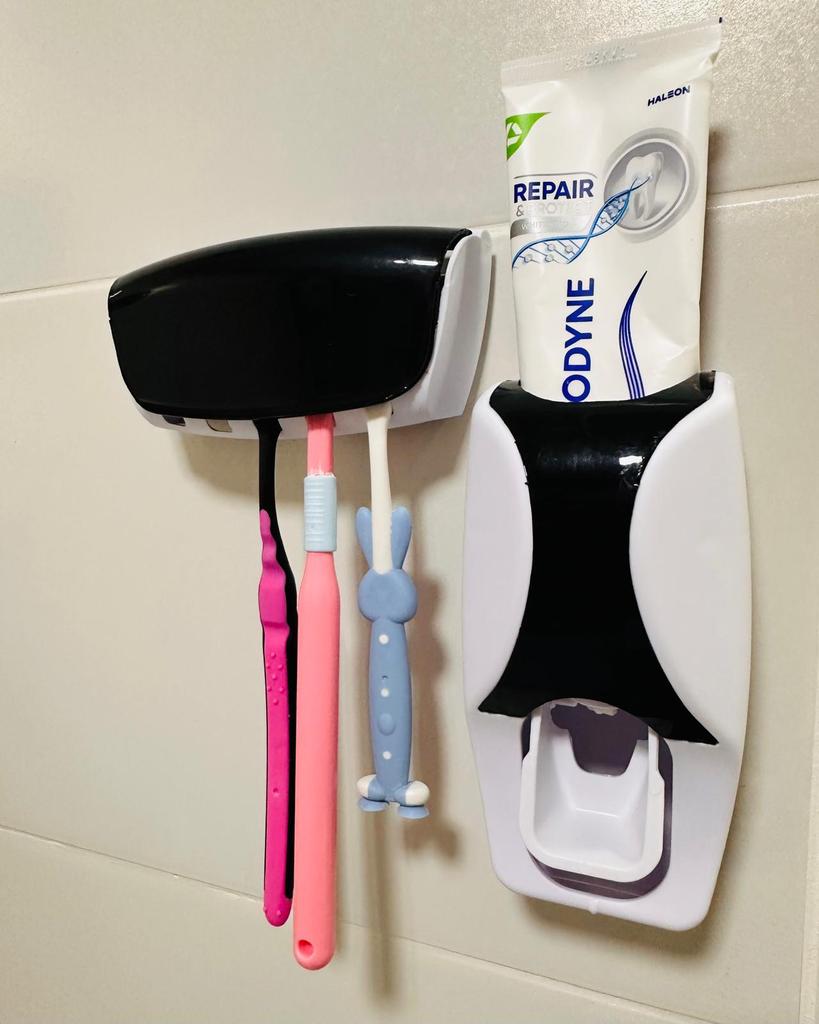 A practical and innovative bathroom set including an automatic toothpaste dispenser with a toothbrush holder. The set comes with one toothbrush holder made of high-quality silicone plate, in a compact size of approximately 16x10 cm, which is suitable for working on any smooth surface.. The holder not only looks clean and organized, but is also hygienic and convenient for daily use, making it ideal for home, hotel, or kitchen. A perfect solution for organizing and maintaining the cleanliness of toothbrushes and toothpaste.