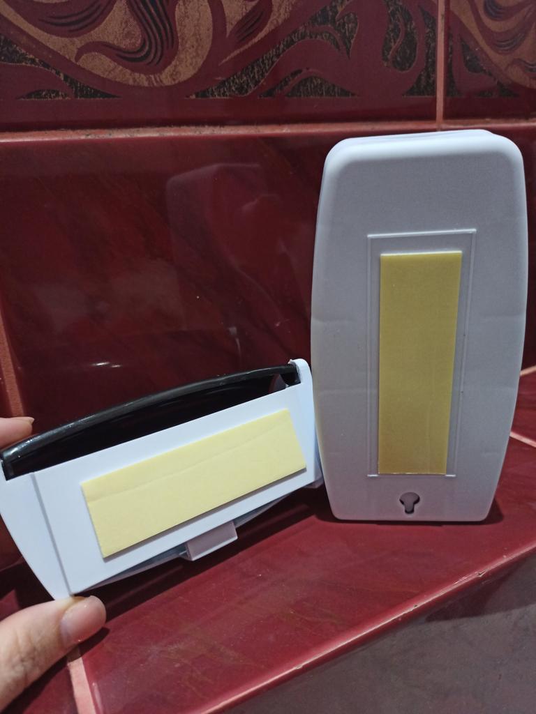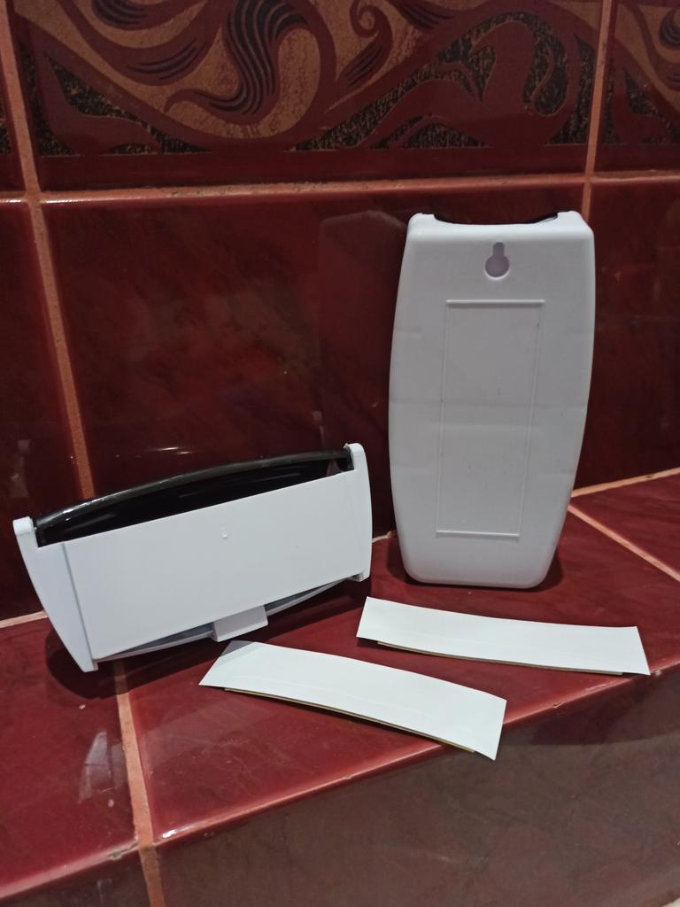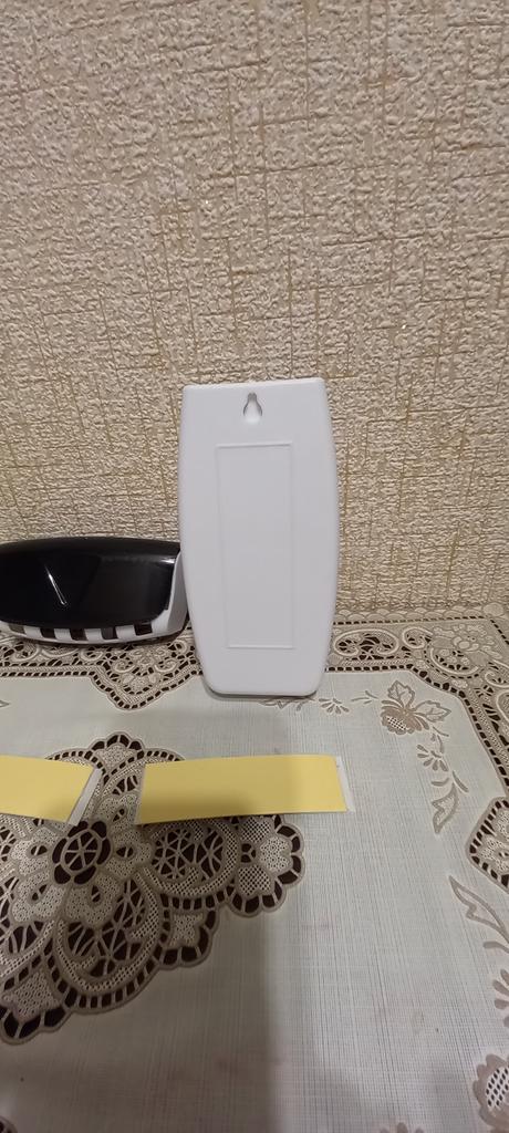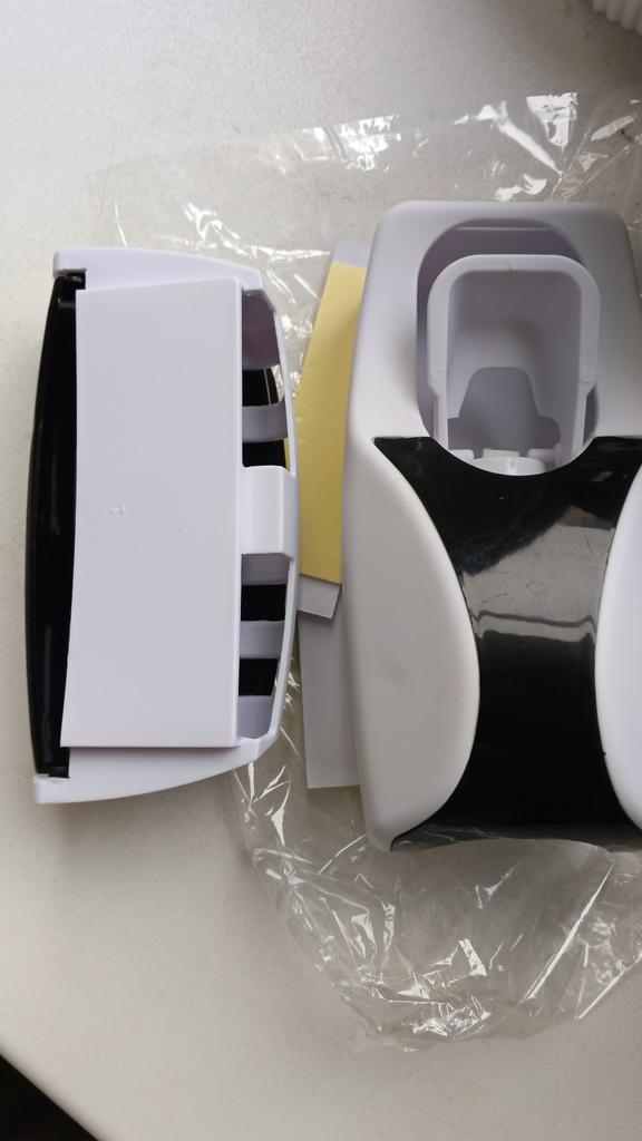 Set of wall-mounted organizers for the bathroom. Made from plastic. The set includes: Toothpaste dispenser Toothbrush holder. Two self-adhesive plates for the wall. Workmanship is excellent. The set is convenient, saves space, is aesthetically pleasing and hygienic. Attaches to a clean, dry surface, holds firmly. The set arrived well packaged without any foreign odor. I definitely recommend buying.