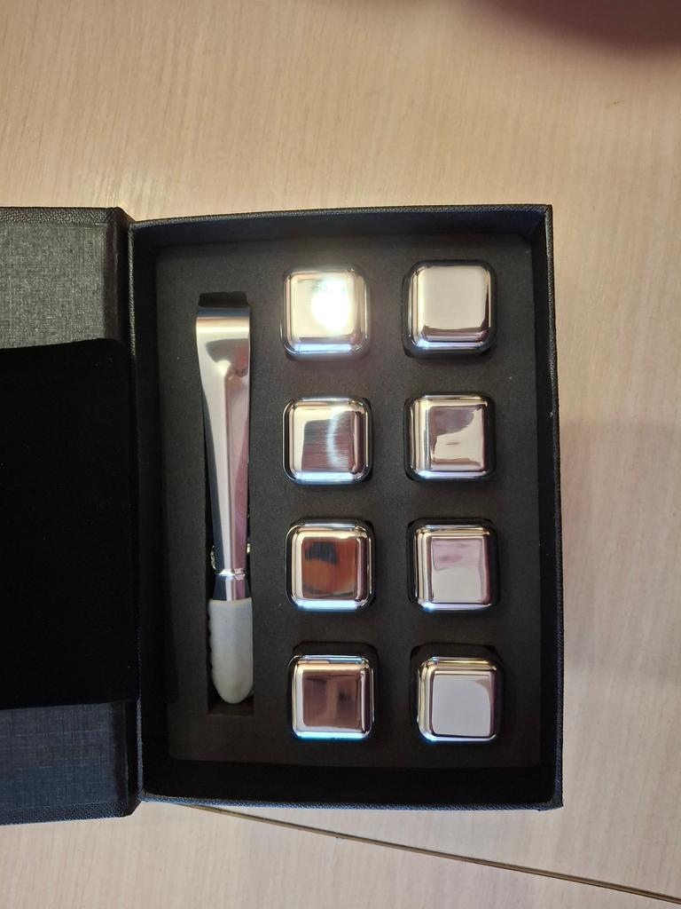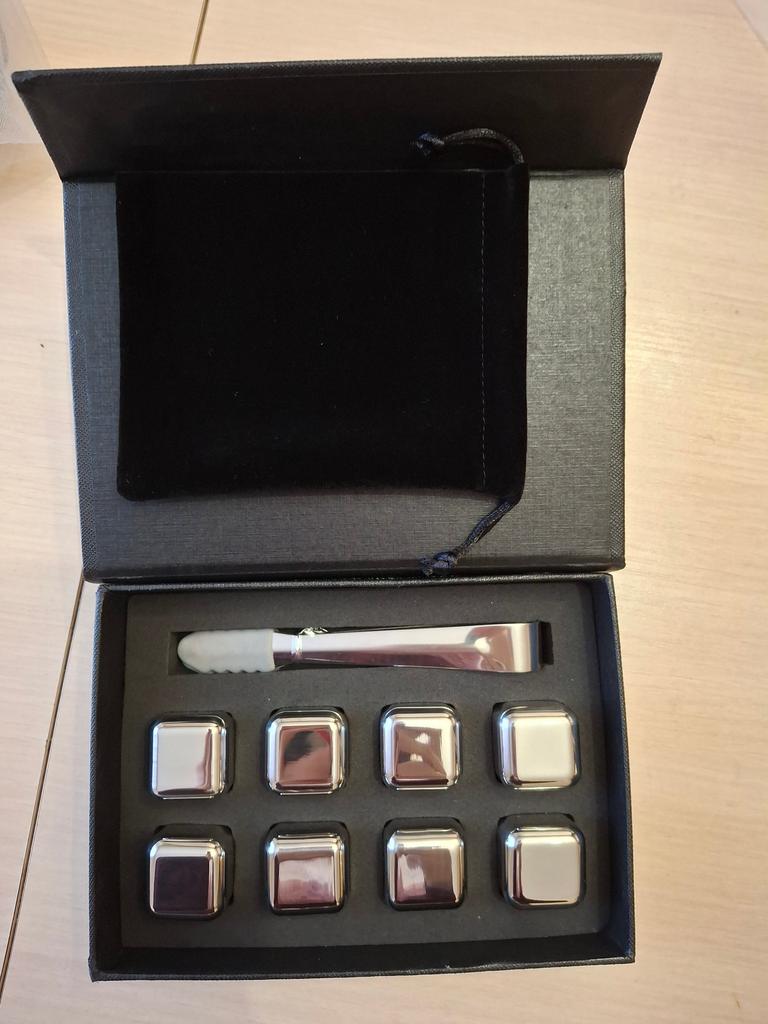 Each set includes eight polished stainless steel chilling cubes and a convenient pair of tongs, all neatly presented in a gift-ready storage box. Crafted from food-grade 304 stainless steel, these cubes are not only rust-resistant and durable but also feature a core of a non-toxic mixture of water and glycerin.