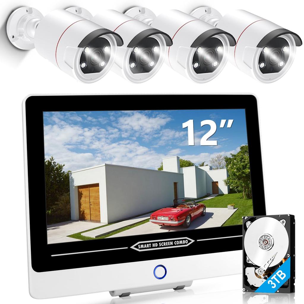 [12-inch integrated parent unit eliminates the need for an external display]: The parent unit integrates a 12-inch LCD monitor, saving space and eliminating the need for a separate monitor. The HDMI port allows connection to a large external display. The security monitor supports 8 megapixels, beautiful color reproduction, and can accommodate additional 5MP/8MP cameras. The large back surface dissipates heat for excellent durability. This set includes four POE security cameras, but you can add up to eight and view and play in full, 4-split, or 8-split screens. With a network connection, you can remotely monitor from your smartphone or computer.