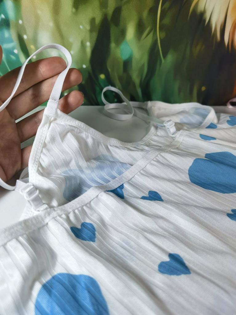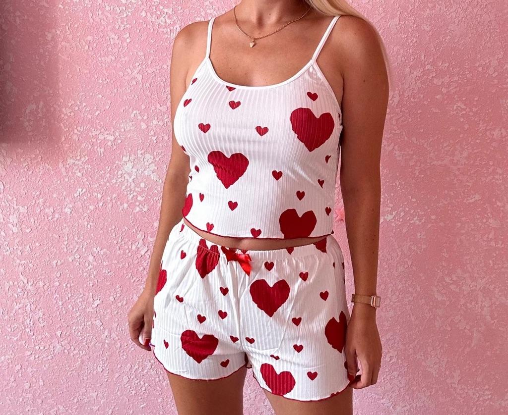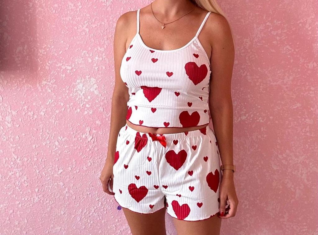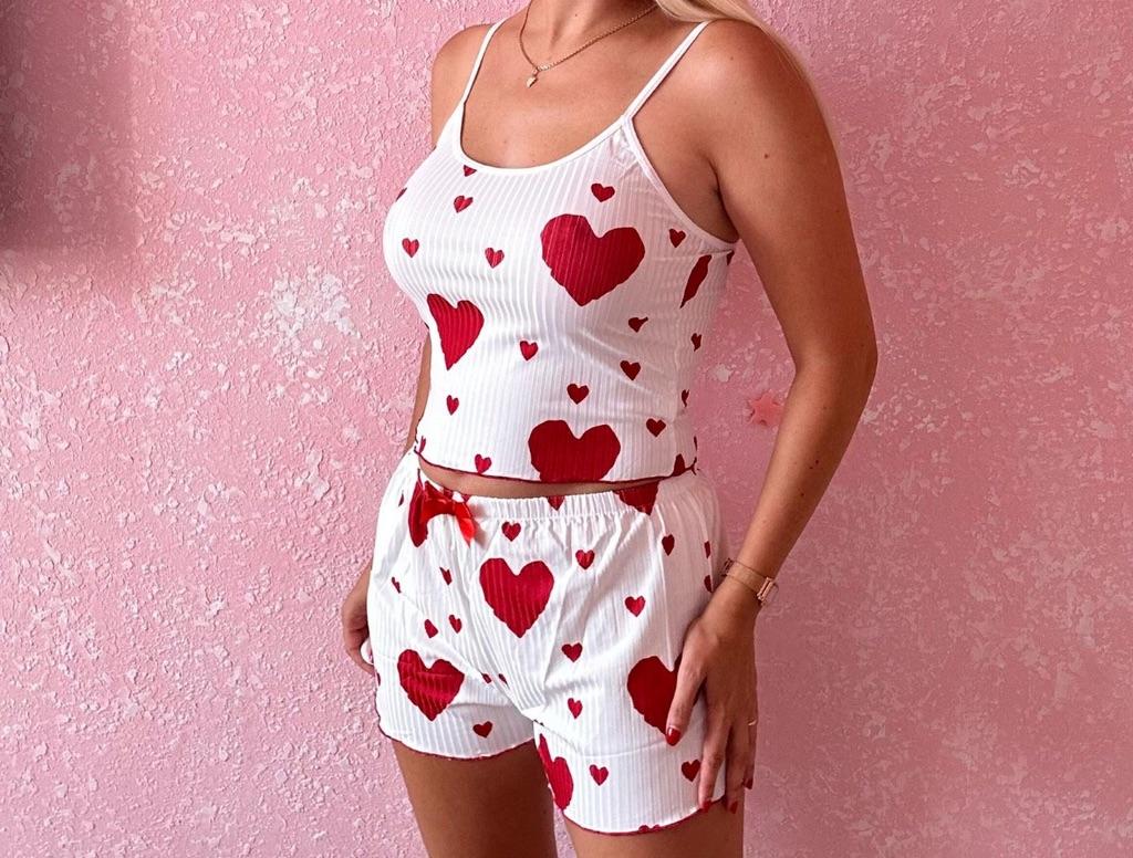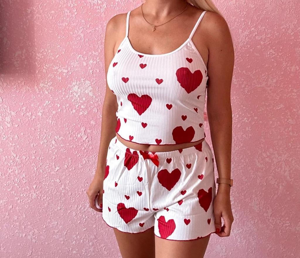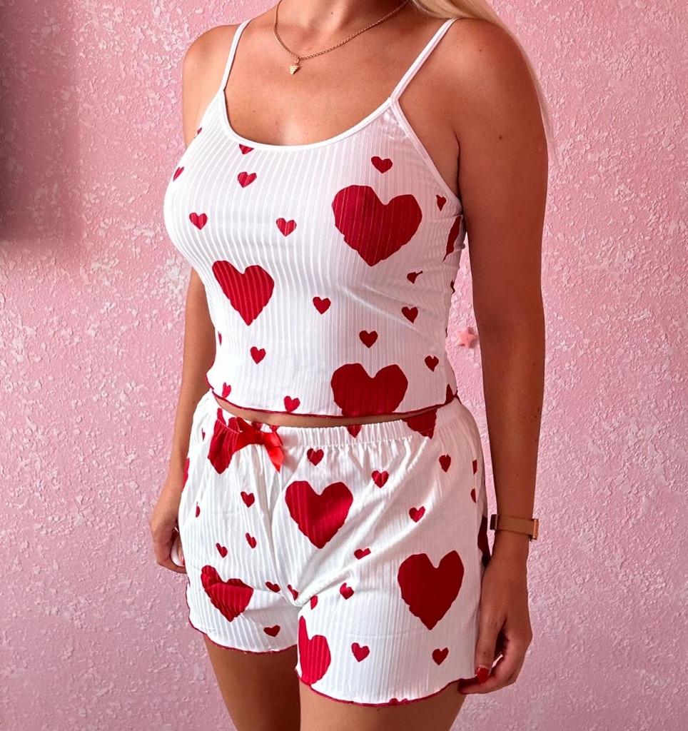This pajama set is designed for summer and combines comfort with a light and fresh look.: *Characteristics: - Includes a *spaghetti strap tank top* and shorts – suitable for warm nights. - *Knitted polyester fabric* – soft, breathable and ventilated. - *Love Print* design in a geometric style – gives a young and casual look. - *Sleeveless*, light and comfortable to move in. - *Sizes*: S, M, L. - *Main Color*: White. Suitable for sleeping, relaxing at home, or just for a calm and pleasant day.