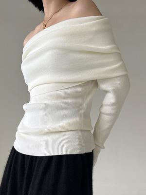 Desire Ruched off-Shoulder off-Shoulder Knitting Bottoming Shirt Silm Slim Looking Gentle Style Long Sleeves Wool Soft Glutinous Inner Wear for Women