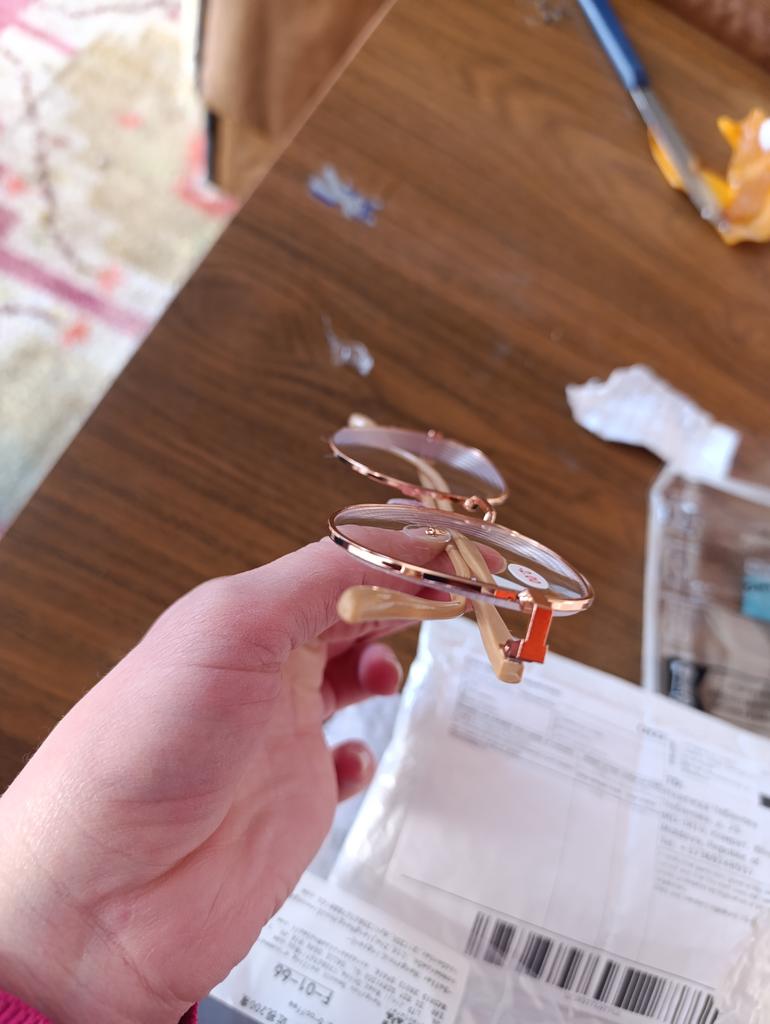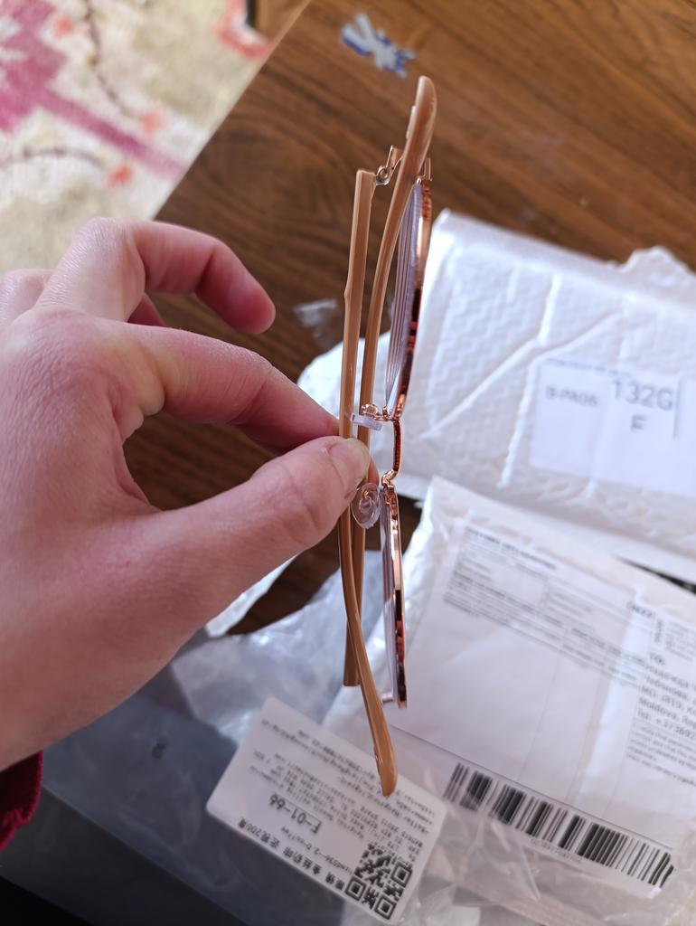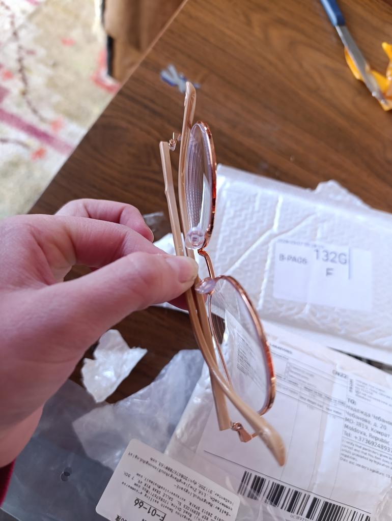 The packaging is normal, they arrived intact, beautiful, but they are crooked themselves. Even when you put them on the table, the crookedness is noticeable, and even more so on the face. I don't know if it's visible in the photo that one temple is hanging in the air. It's a shame, they would have suited me.