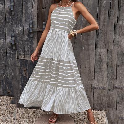 Summer Sleeveless Round Neck Casual Dress Women Print Striped Office Lady Long Dress Woman Elegant A Line Halter Dress Female Clothing 24360