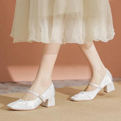 Spring Women High Heels Square Toe Mary Jane Pumps Summer Satin Party Wedding Ladies Solid Elegant Heels Zapatos Mujer