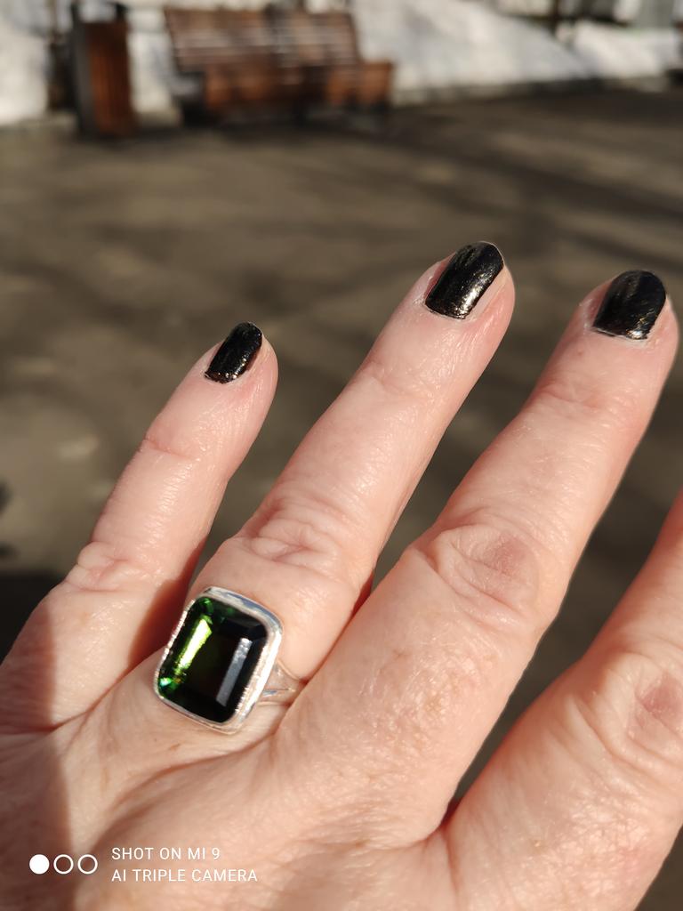 The ring is gorgeous, noble, not very large, with a medium square stone, of a deep green color. It looks wonderful on the hand, expensive. The setting has a 925 hallmark.